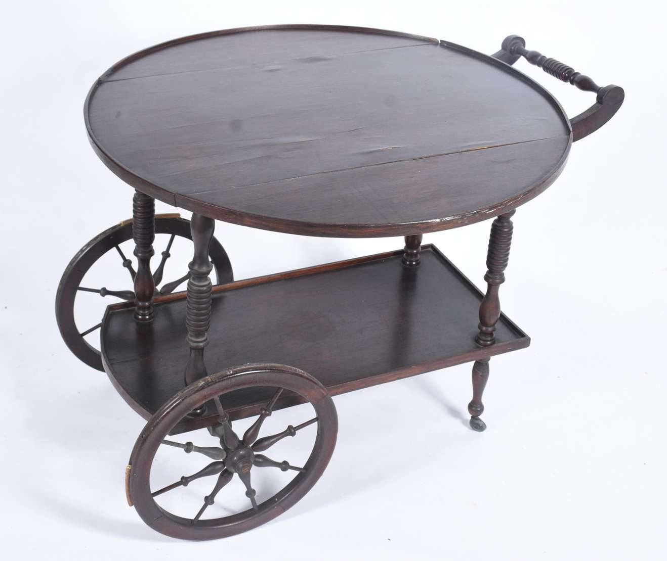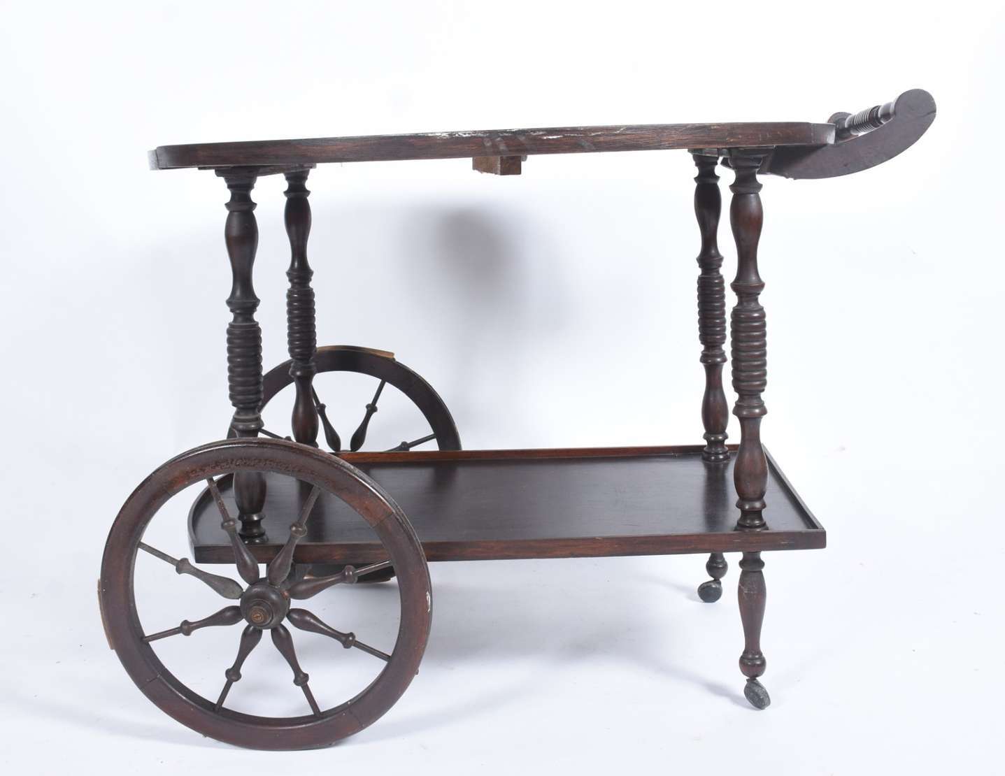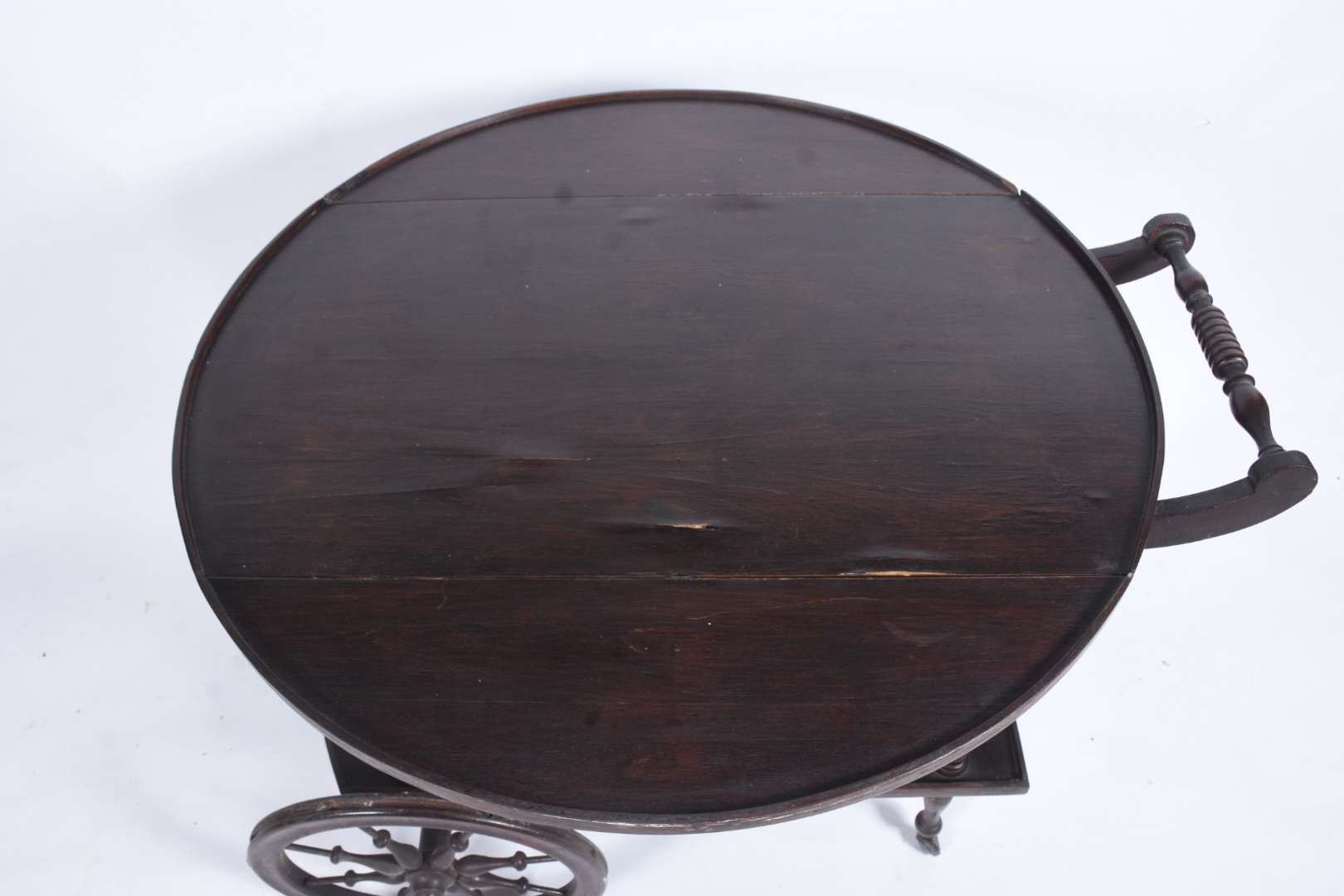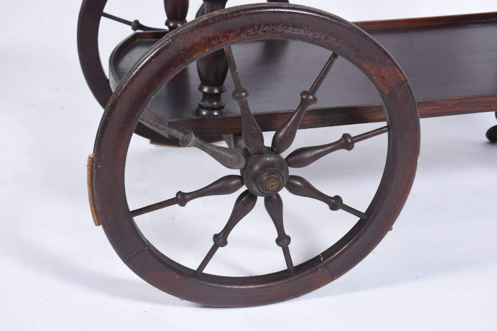 Carrinho de chá de madeira nobre, abas laterais, gradinha de metal dourado, sobre rodízios.