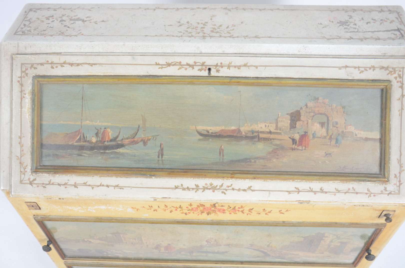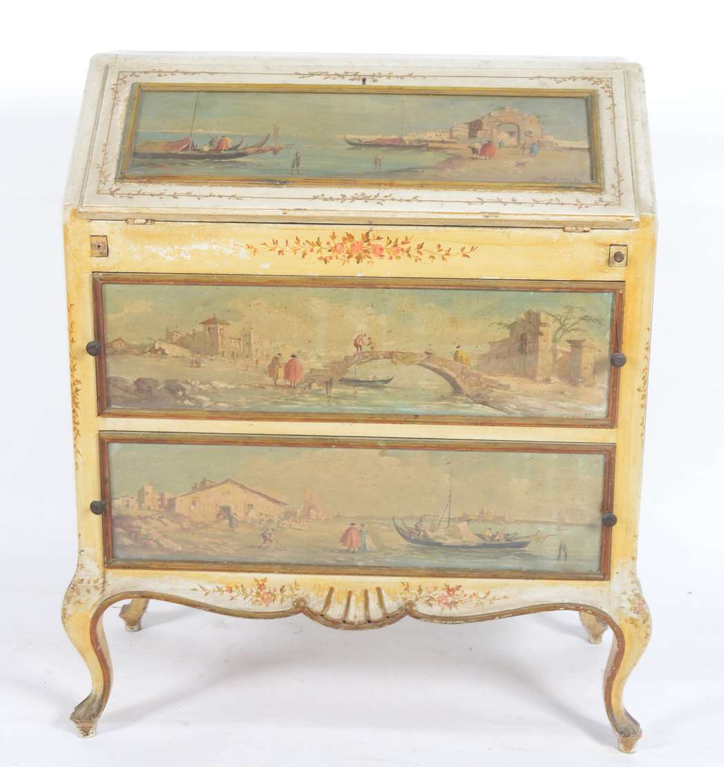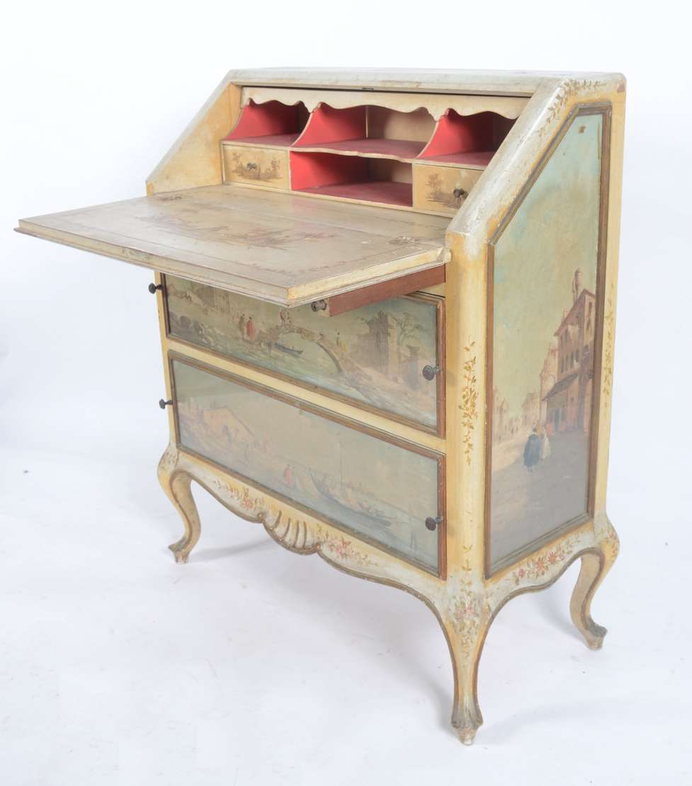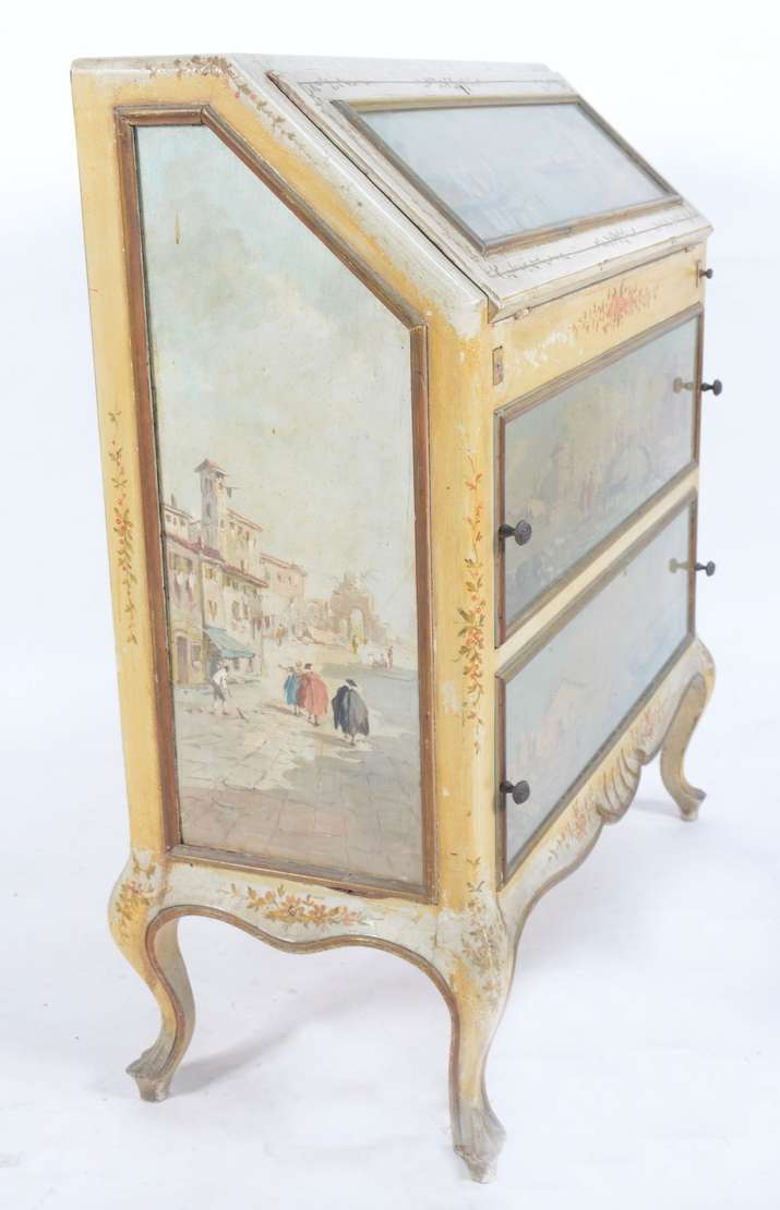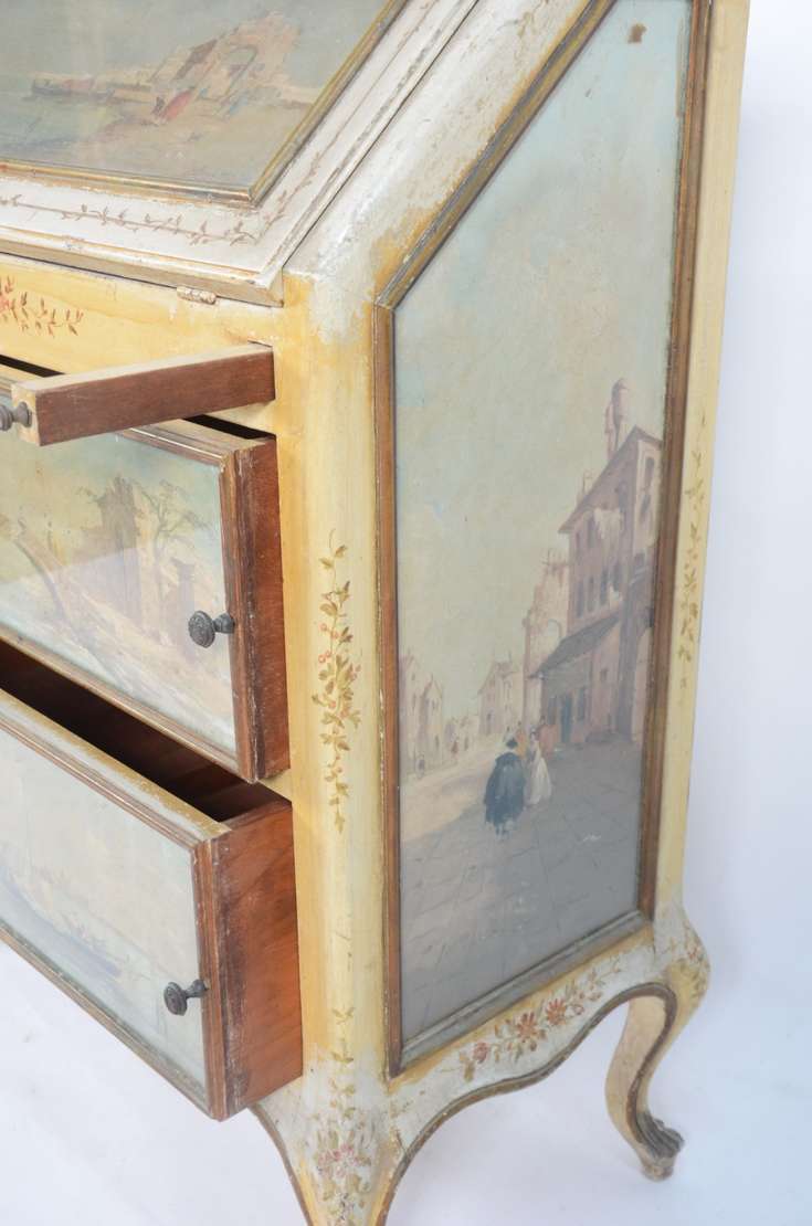 Móvel estilo colonial brasileiro de madeira nobre com puxadores de metal, tampo articulado e uma gaveta externa.