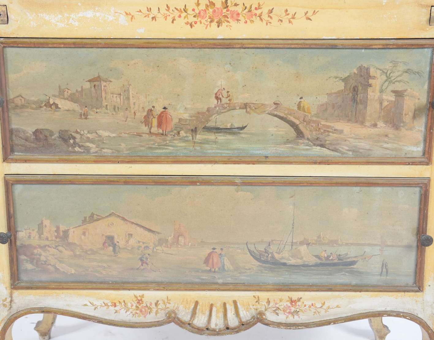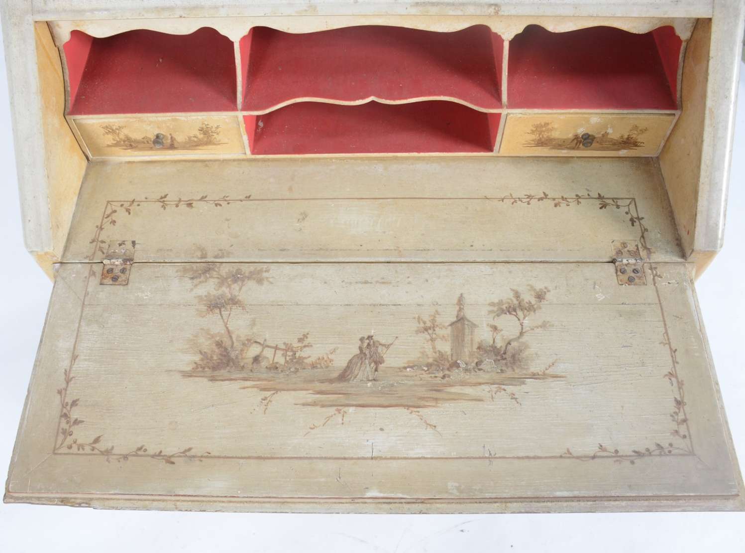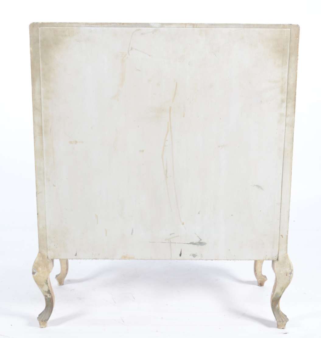 Aparador de metal patinado de verde, saia trabalhada em curvas, pernas arqueadas unidas por traves inferiores, tampo ...