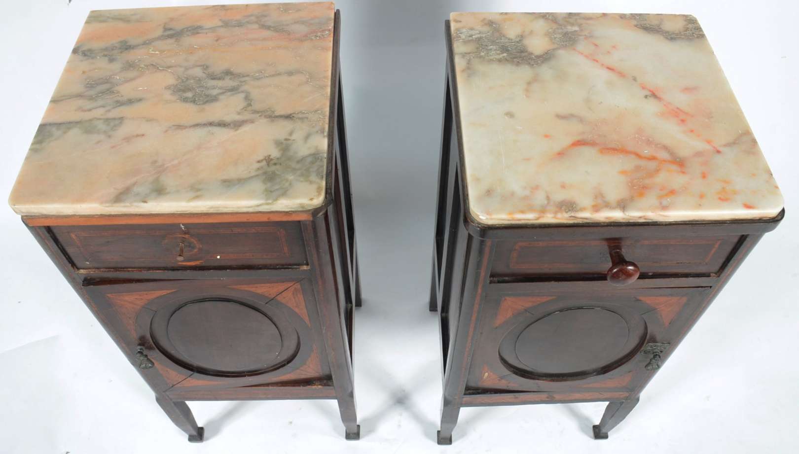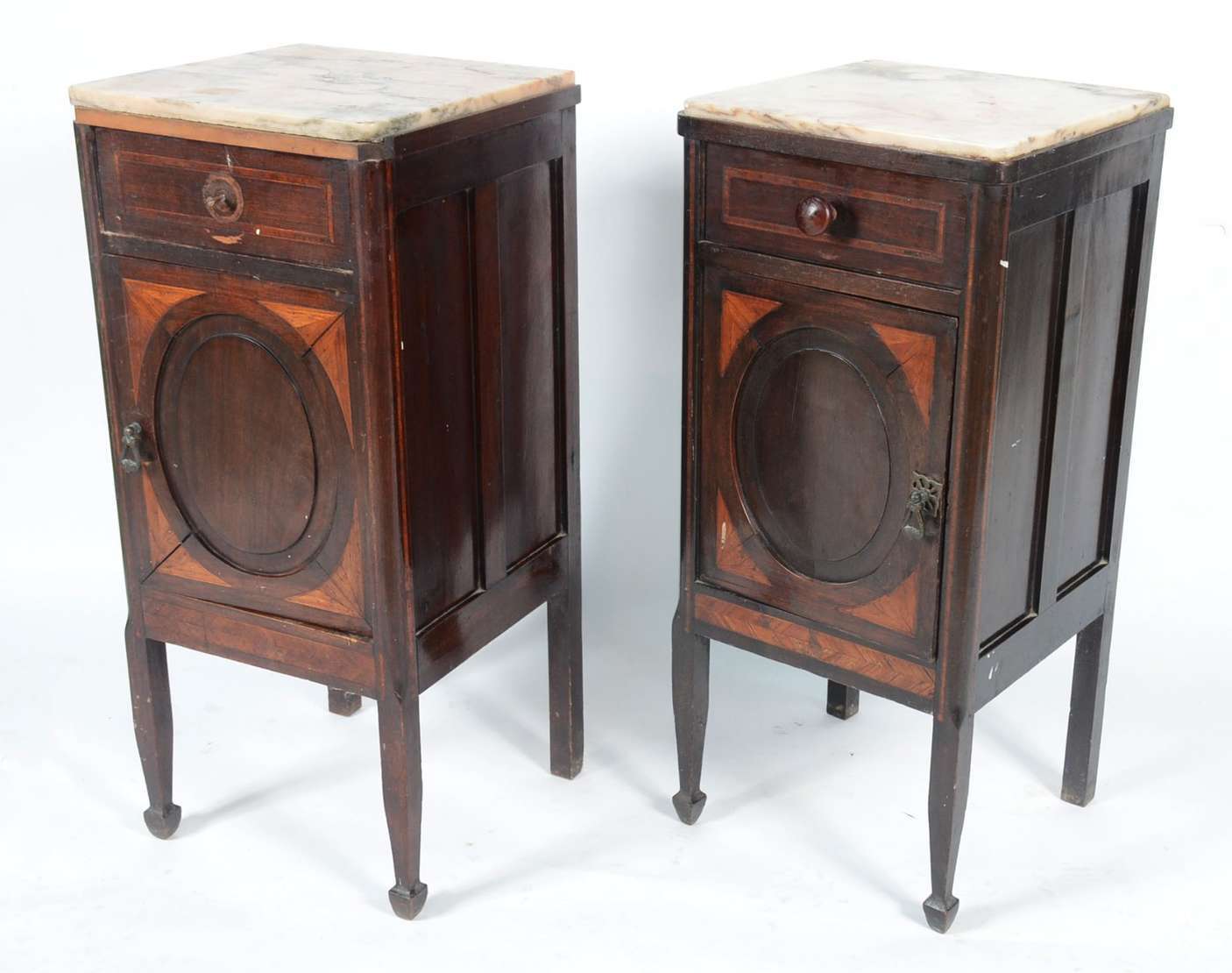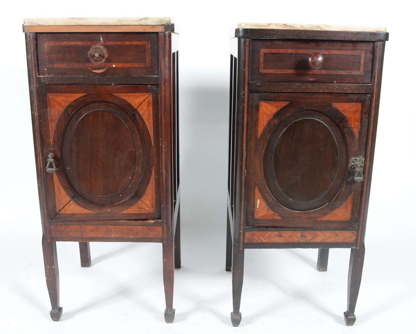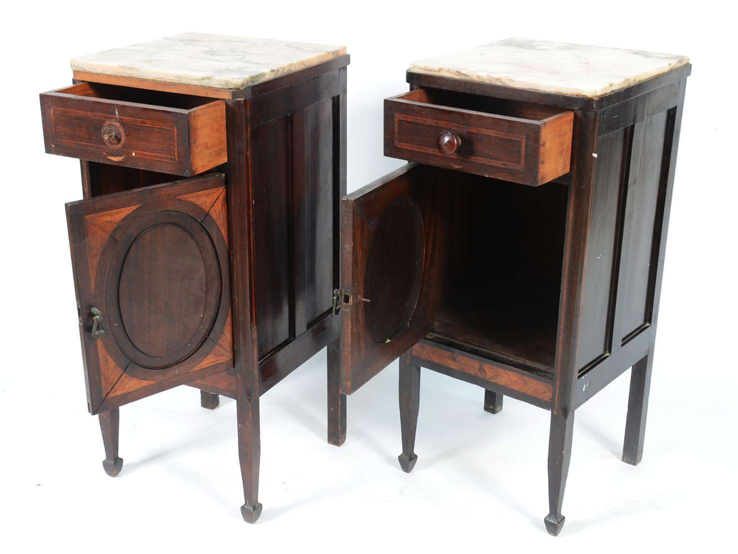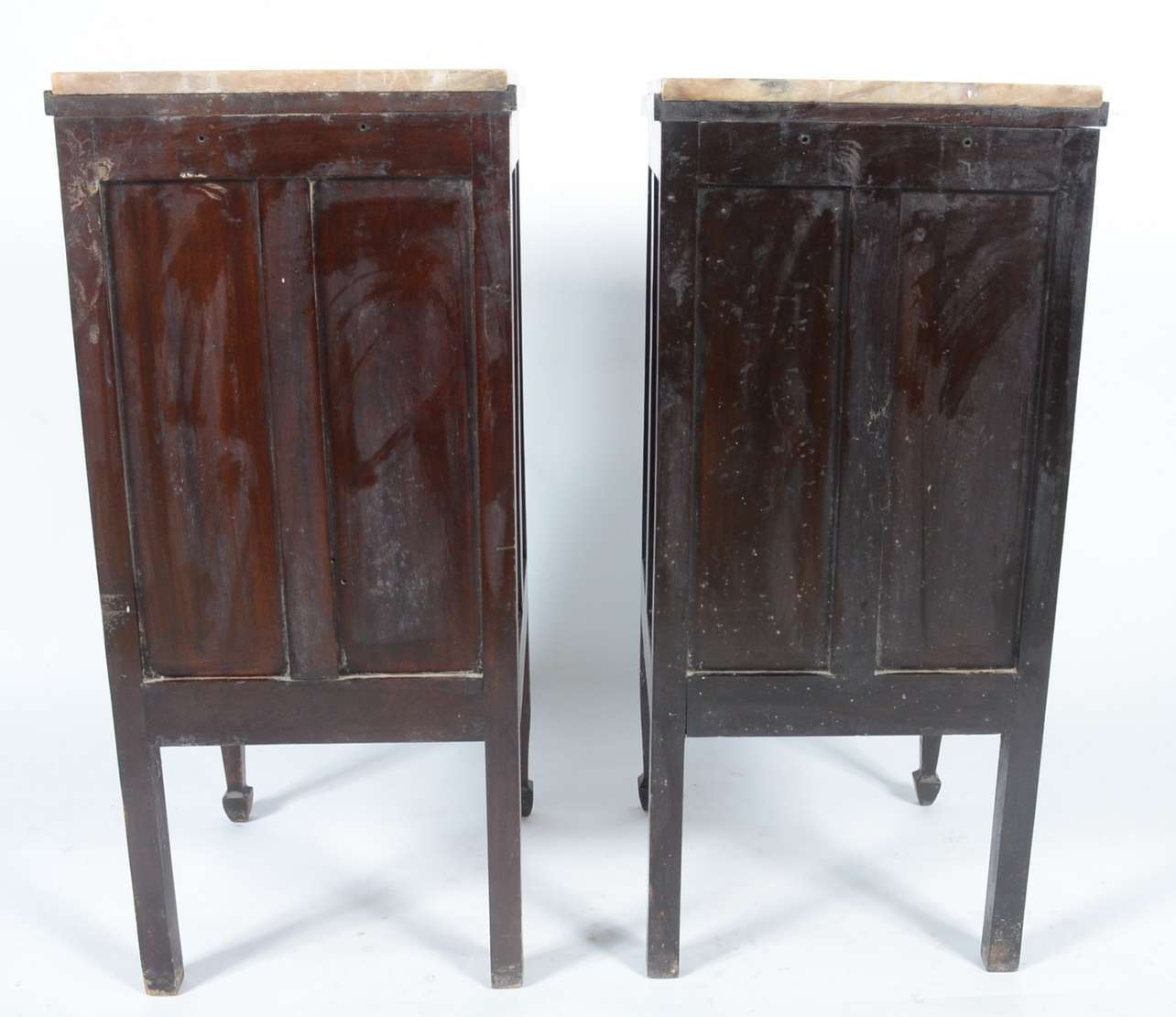 Aparador de madeira nobre, pernas frontais recortadas apoiada em platô inferior, tampo de mármore rajado.