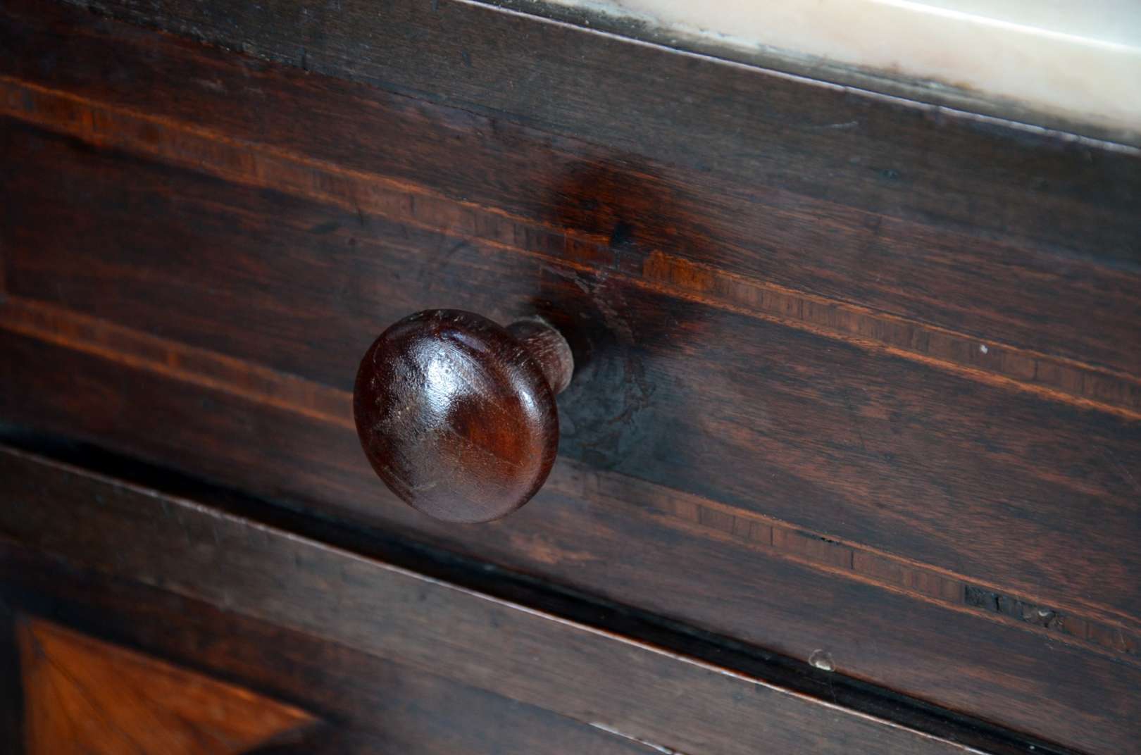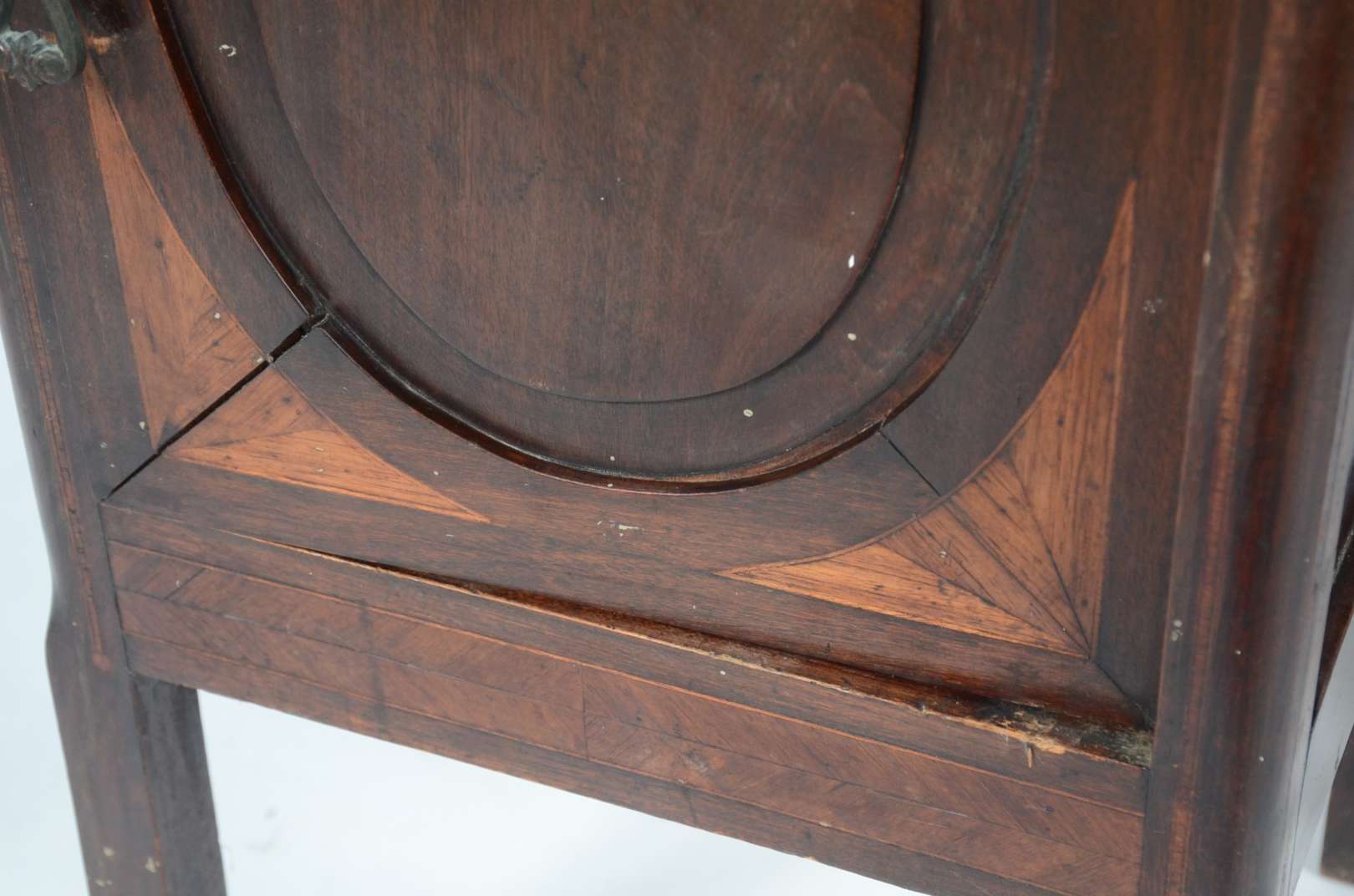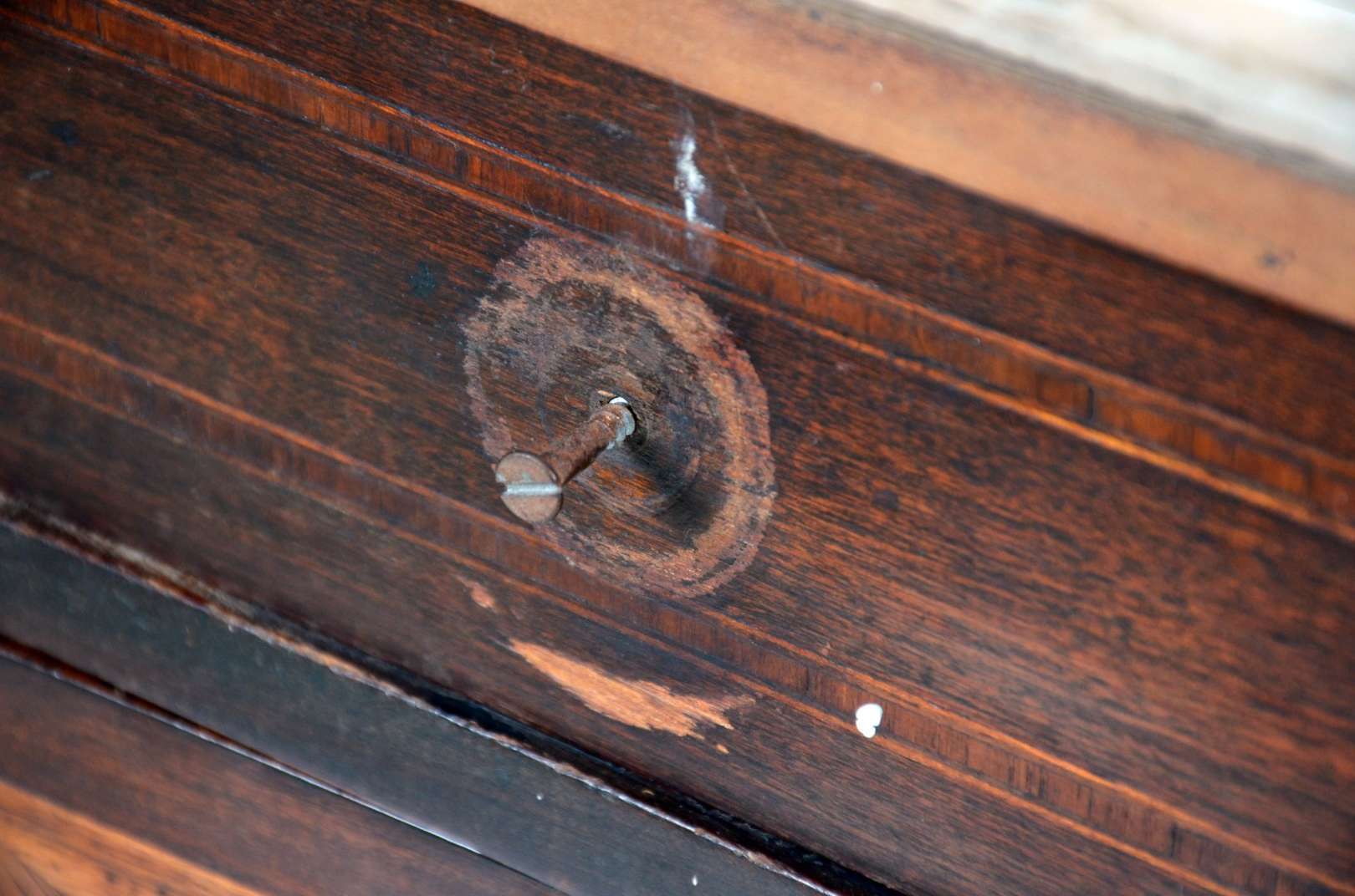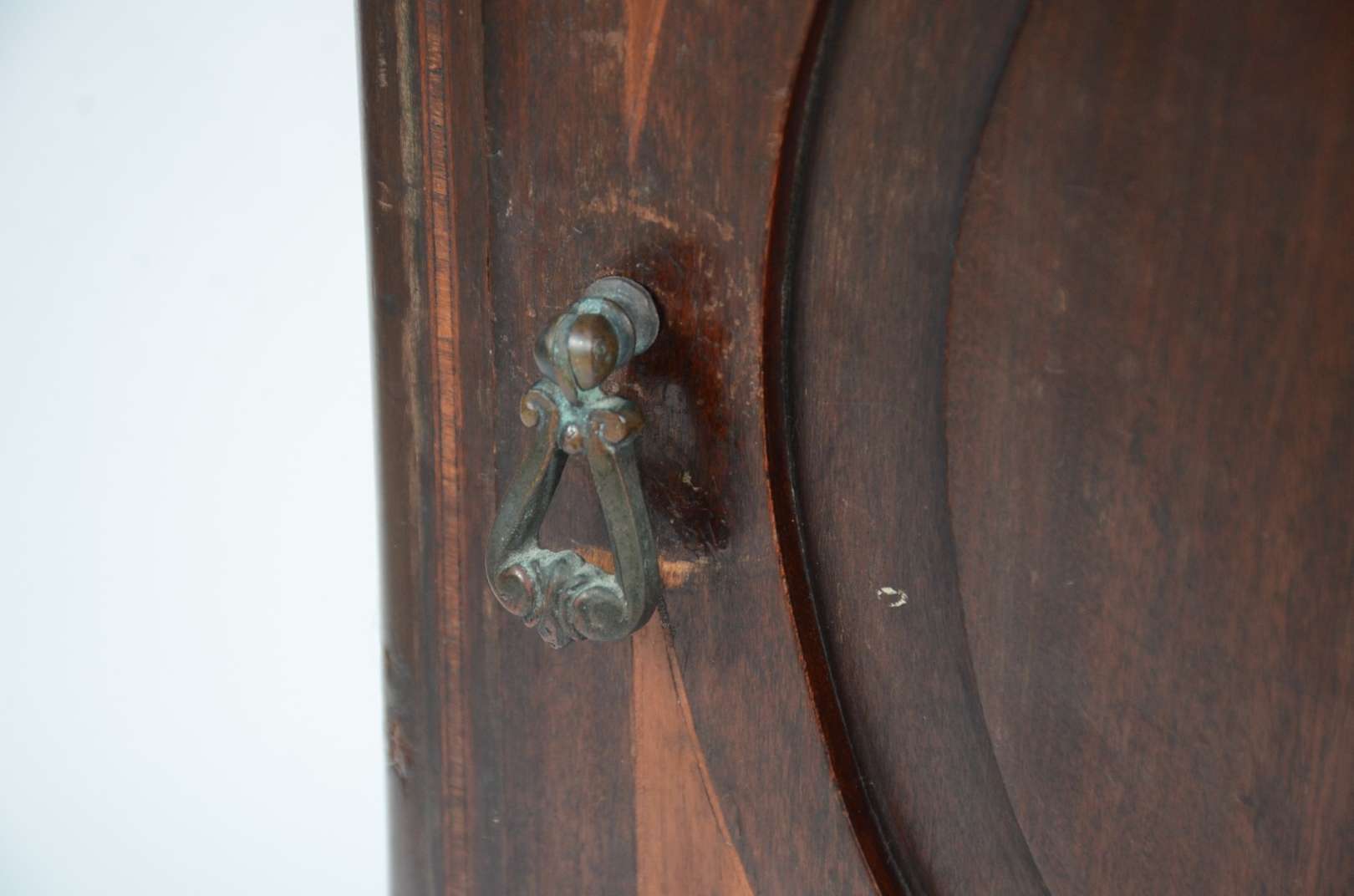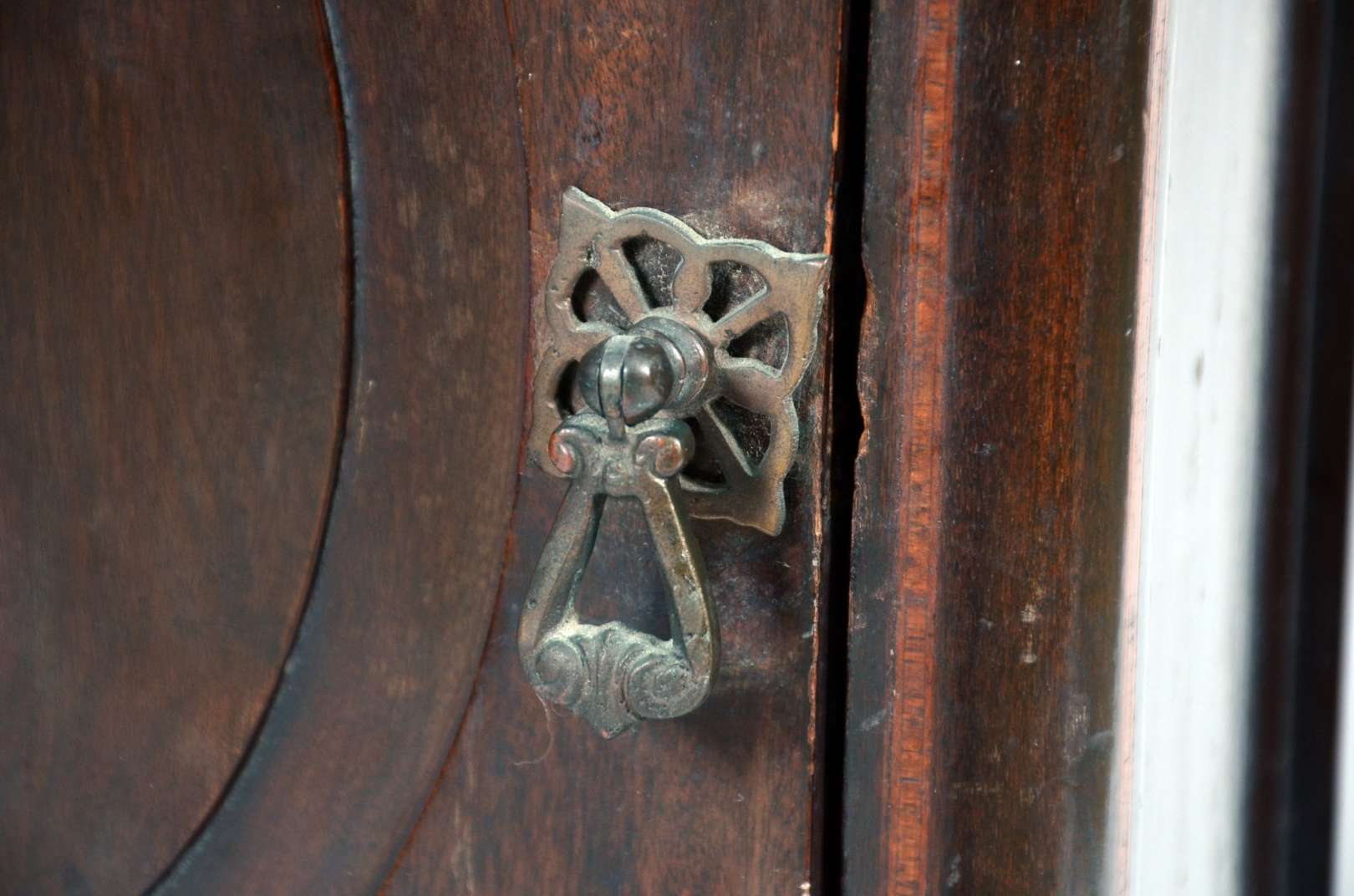 Móvel estilo colonial brasileiro de madeira nobre com puxadores de metal, tampo articulado e uma gaveta externa.