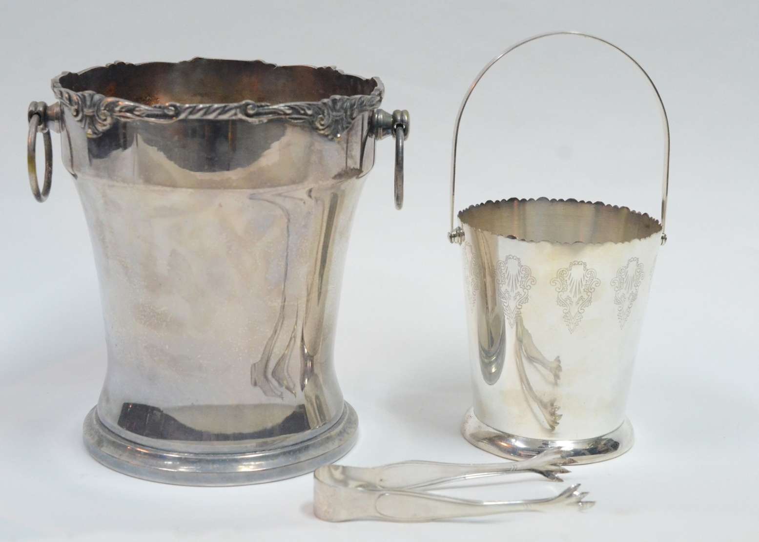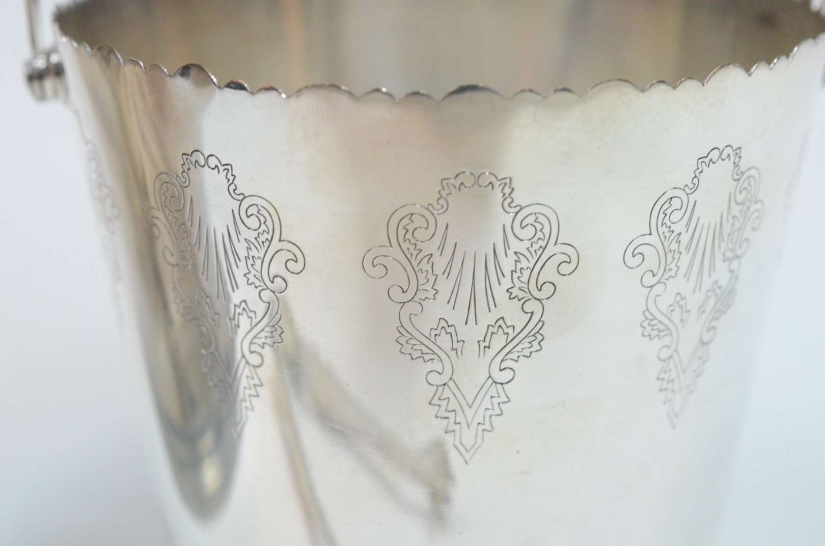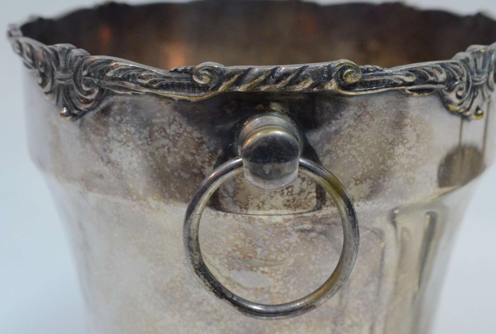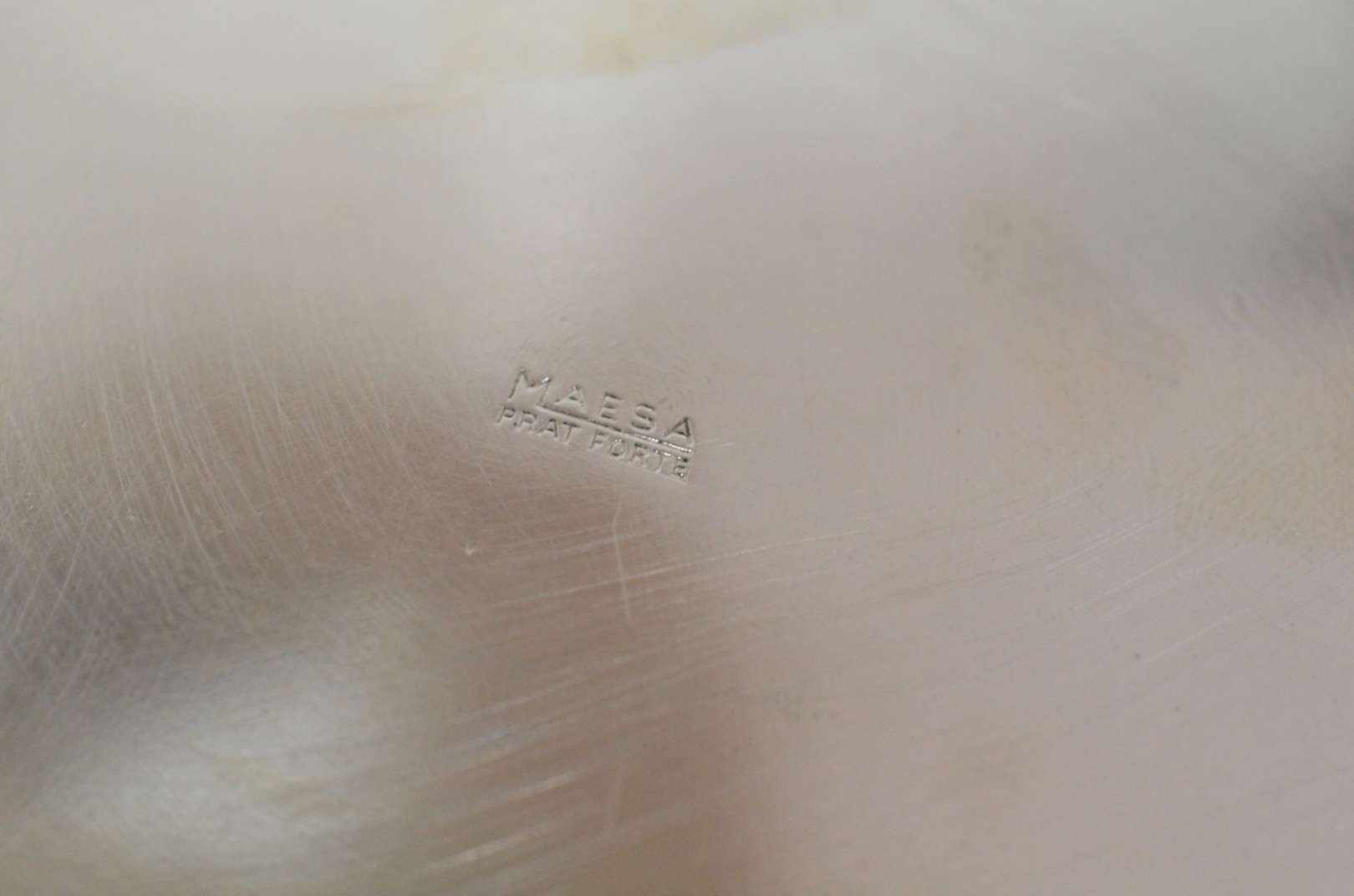 Bandeja com alças de metal prateado, borda trabalhada em relevo, fundo ricamente cinzelado. Desgastes.