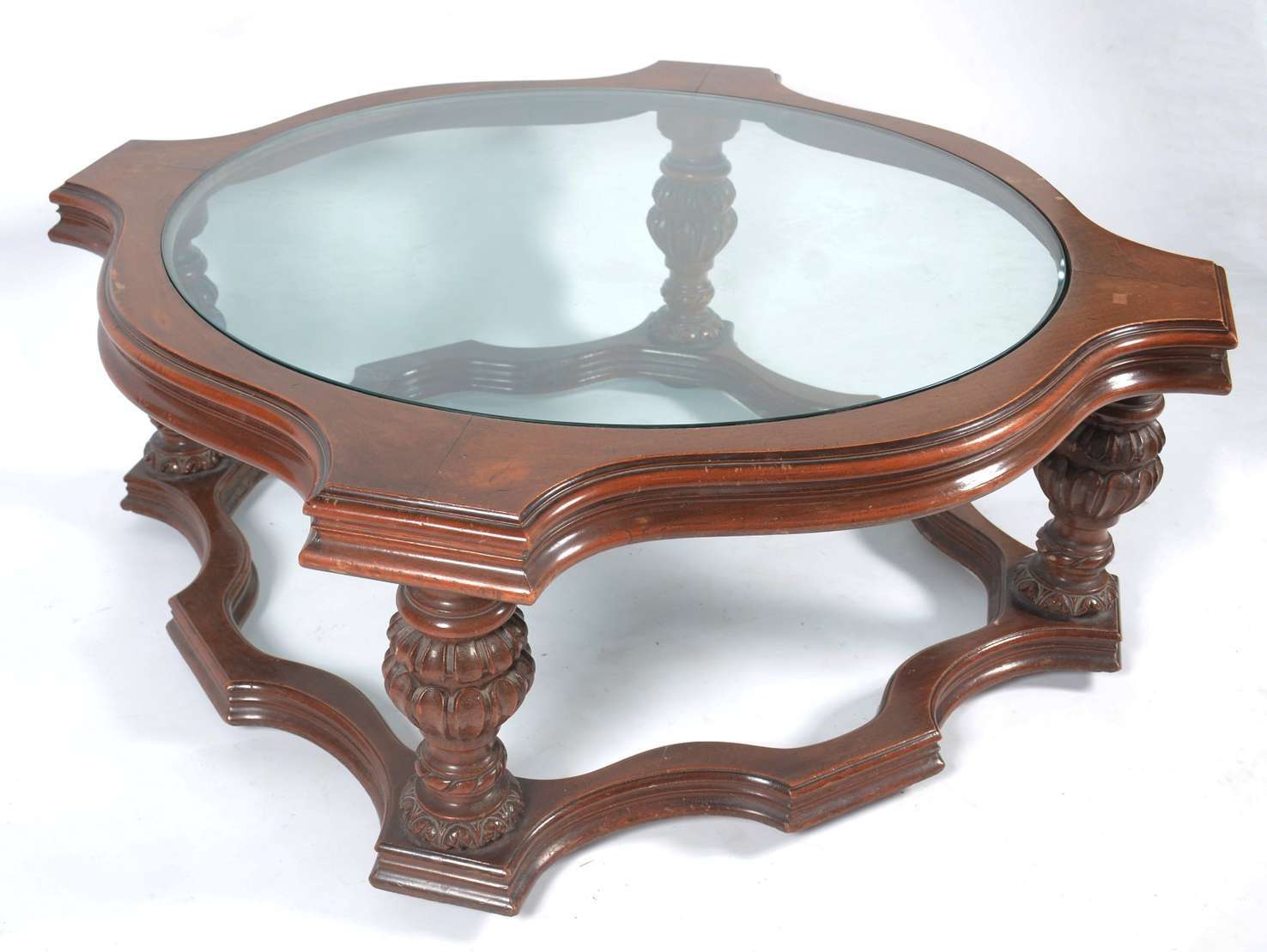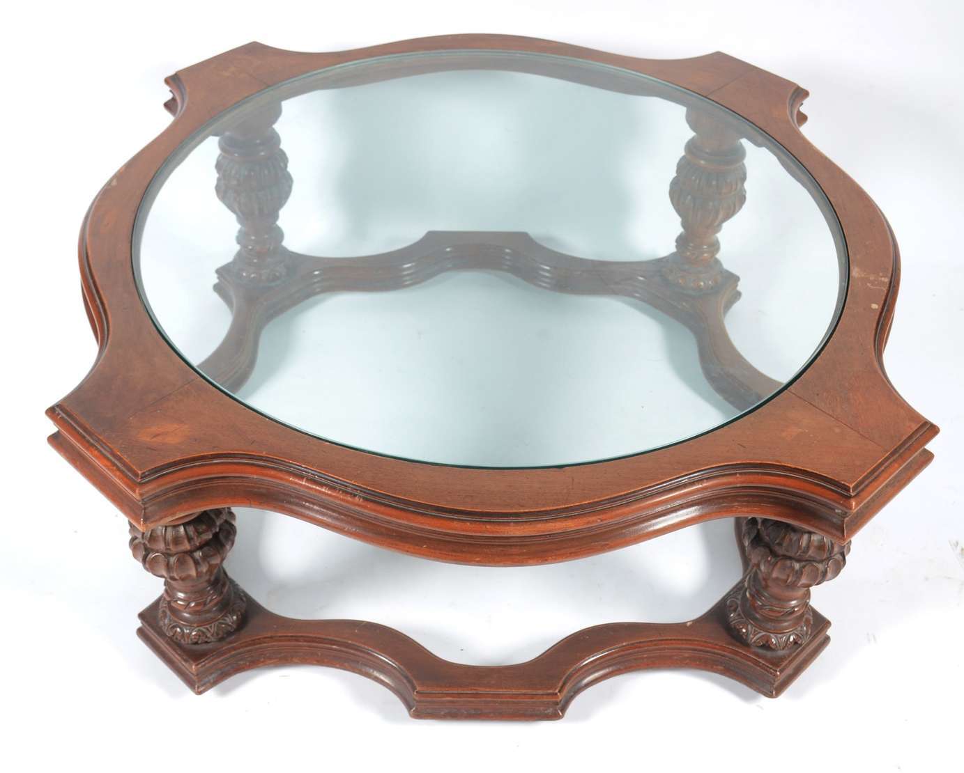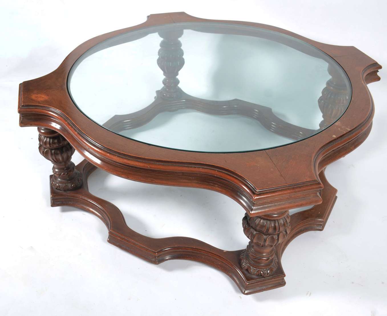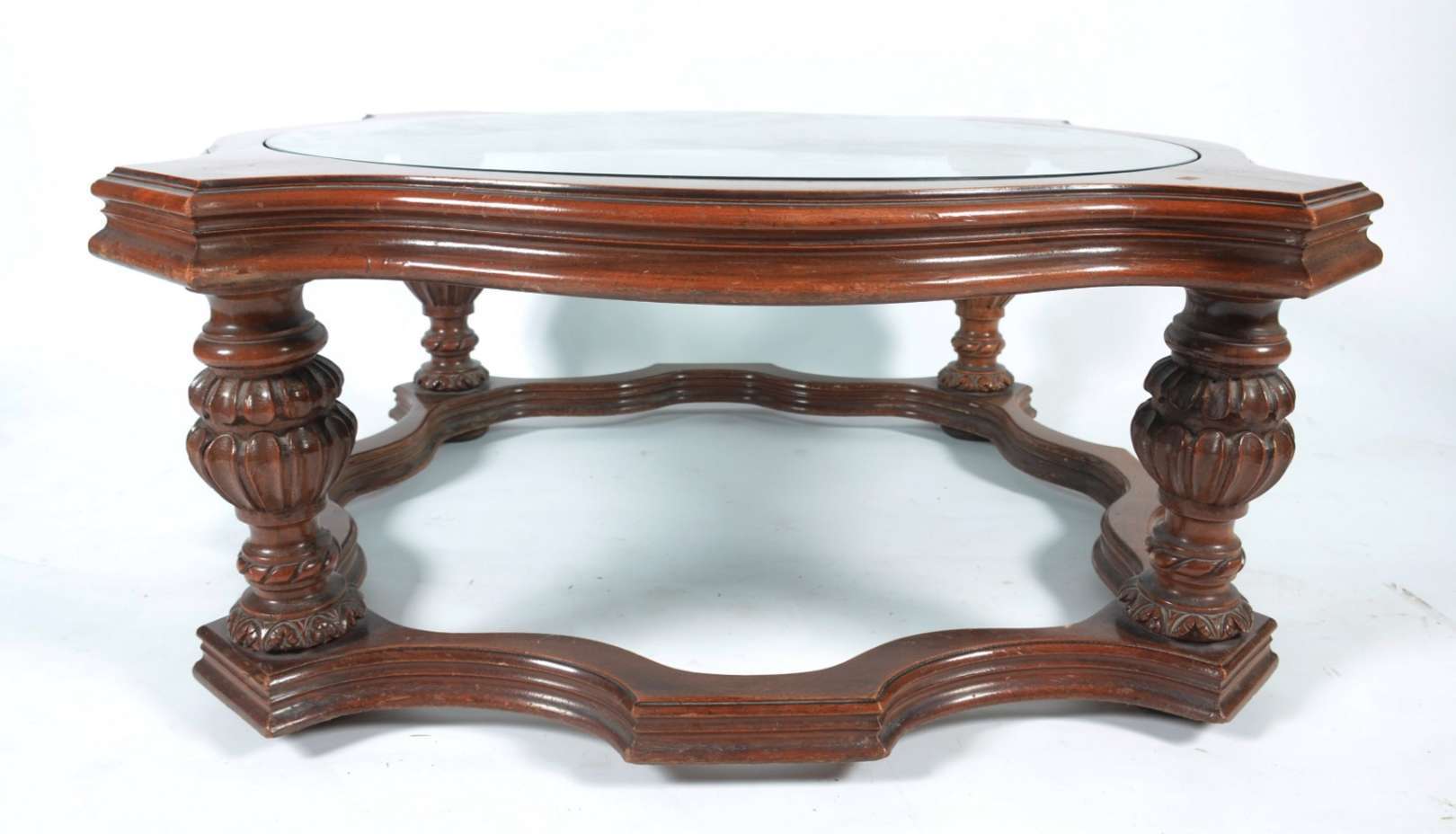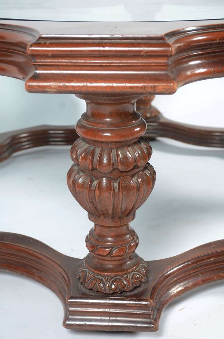 Mesa de centro de madeira nobre com tampo de vidro.