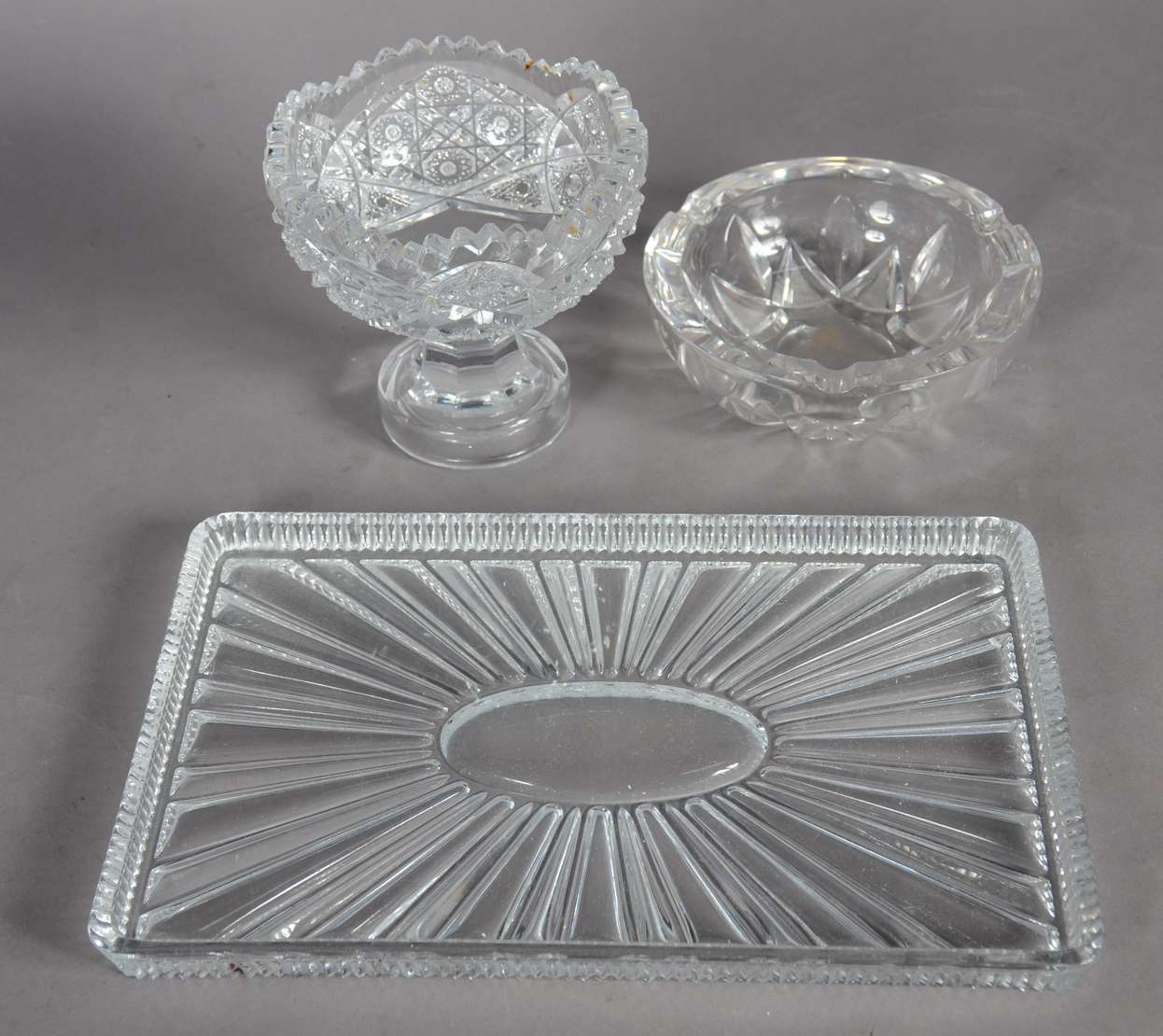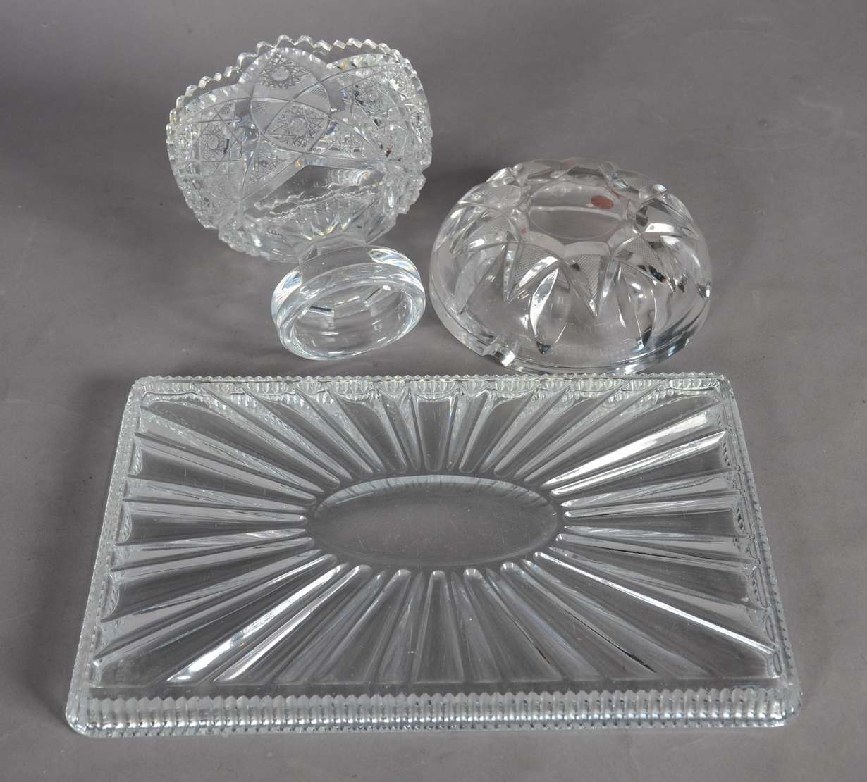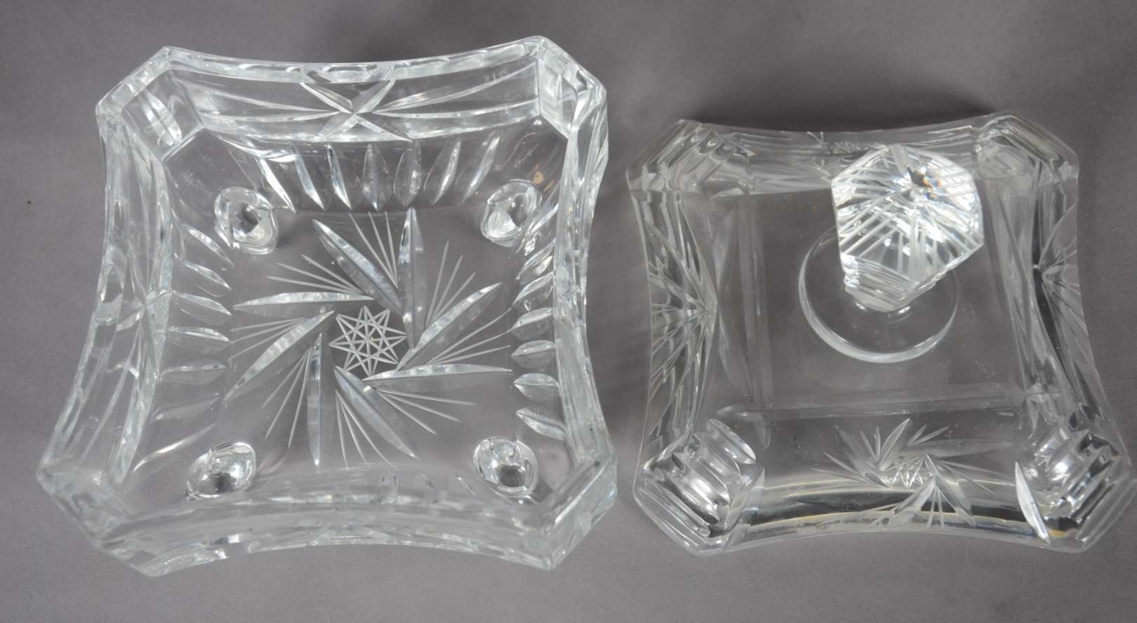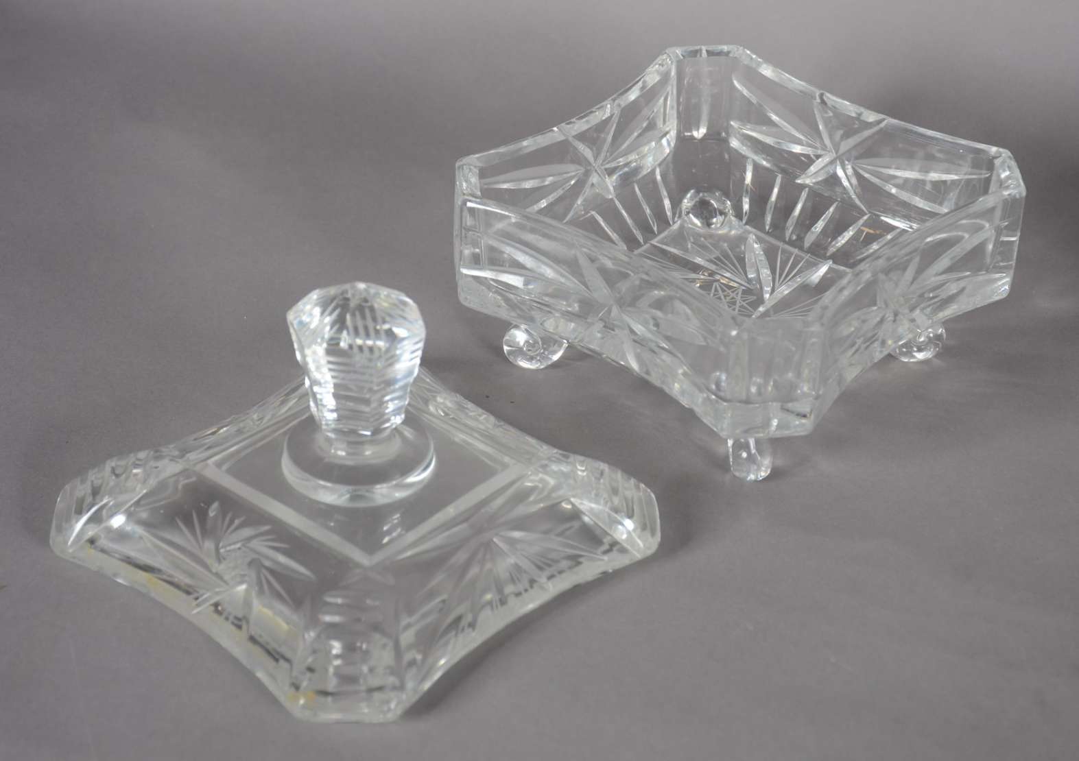 Porta petiscos de cristal com 4 divisórias e recipiente oval central.