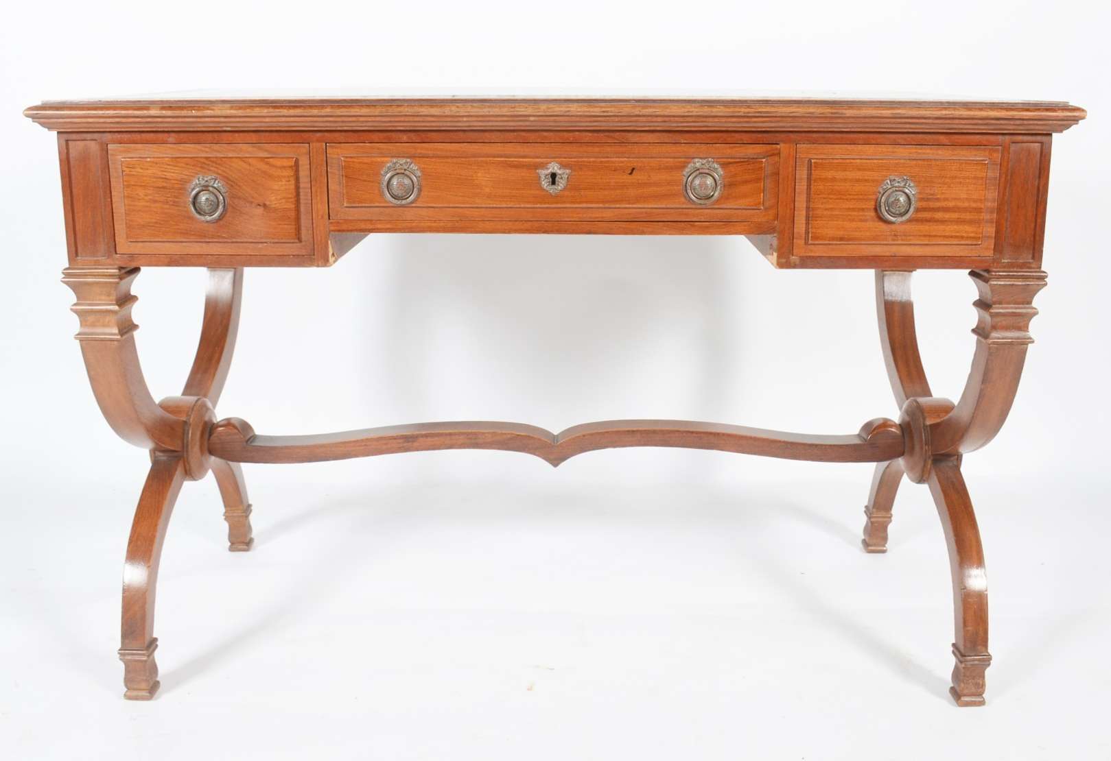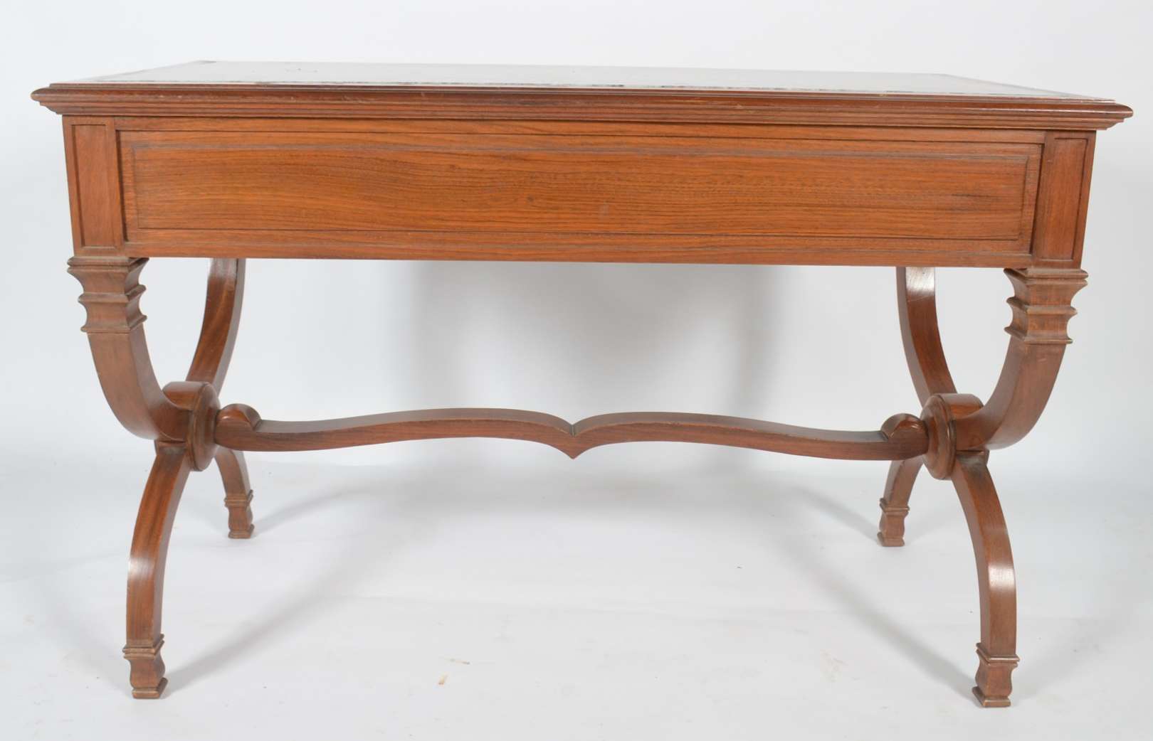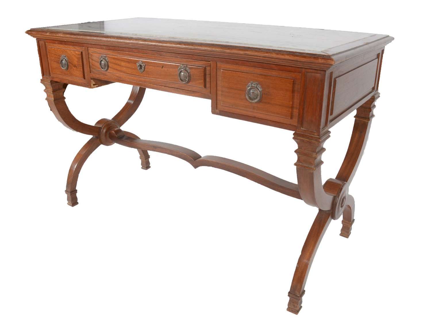Escrivaninha de madeira nobre patinada, pinturas com paisagens italianas nas duas gavetas, laterais e tampo articulad...