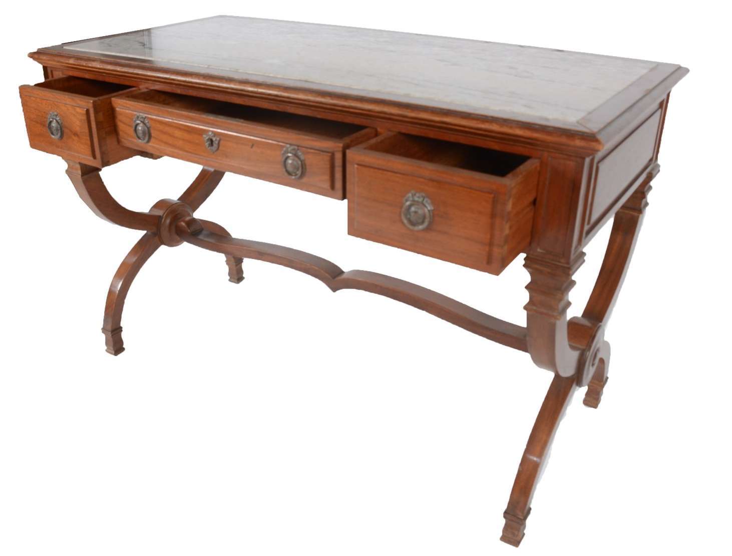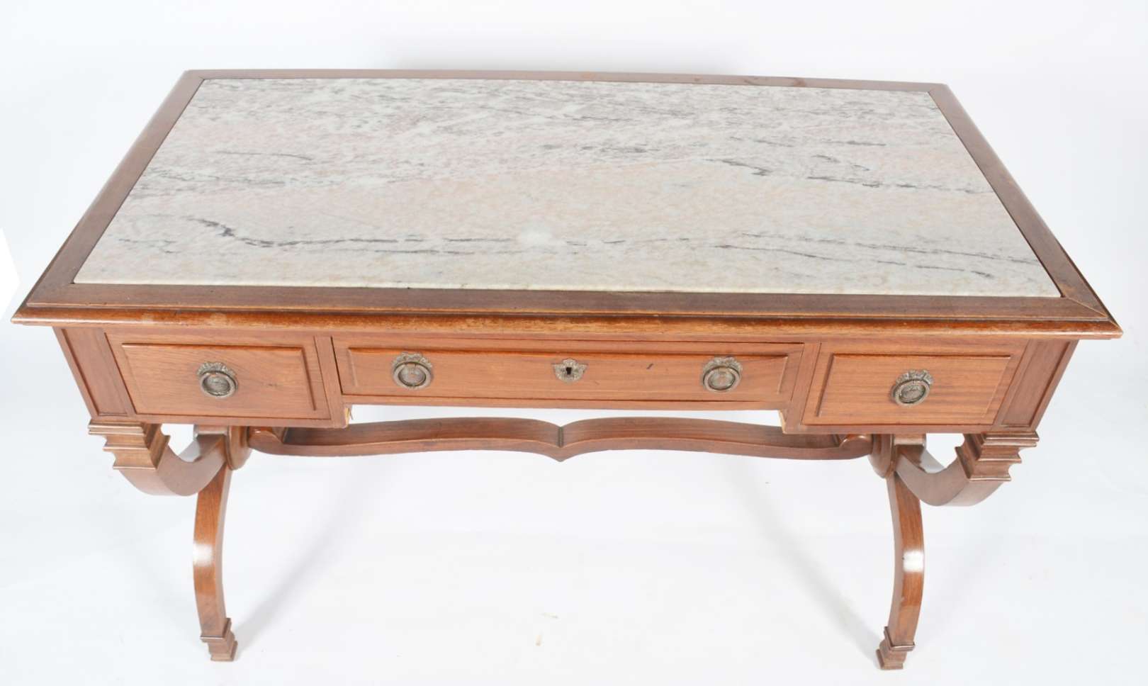 Aparador de madeira nobre, pernas frontais recortadas apoiada em platô inferior, tampo de mármore rajado.