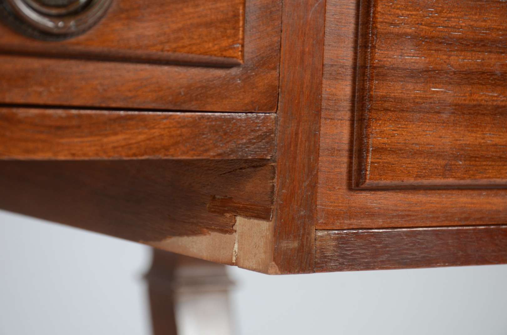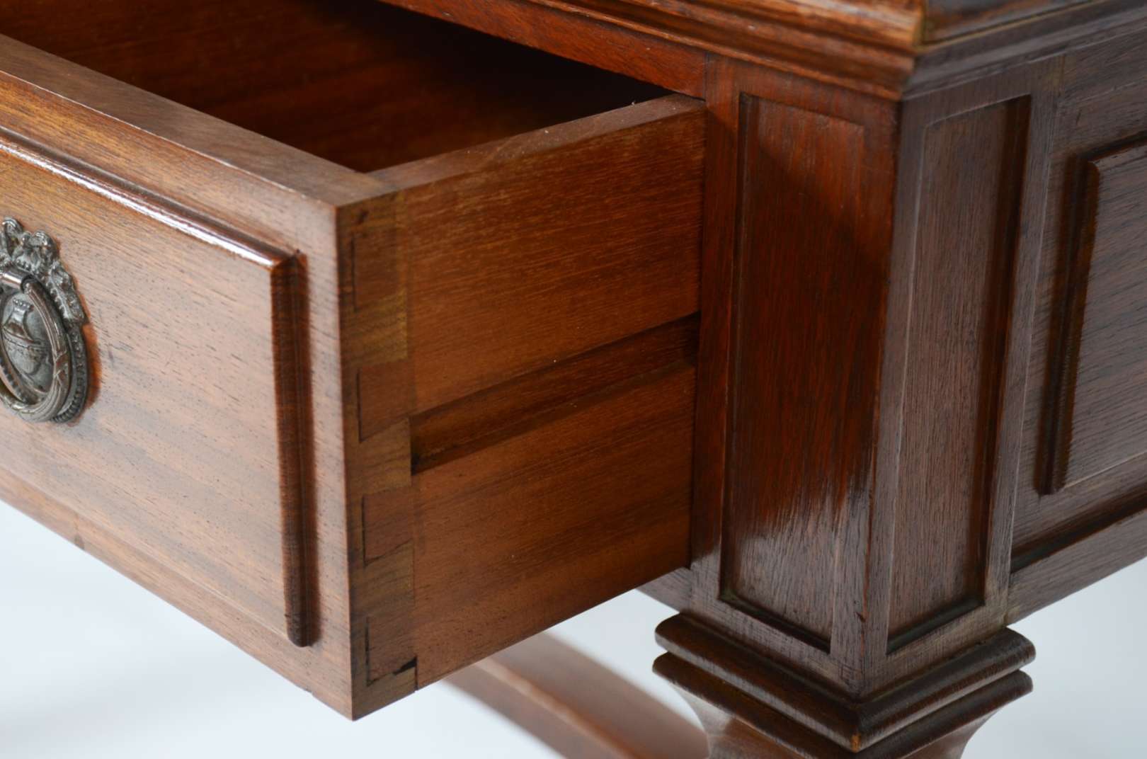 Móvel estilo colonial brasileiro de madeira nobre com puxadores de metal, tampo articulado e uma gaveta externa.