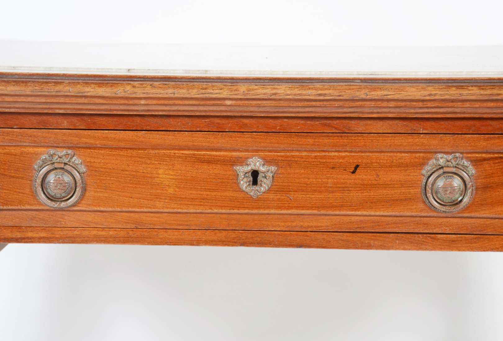 Par de criados mudos de madeira nobre com uma gaveta e porta (um deles sem puxador), tampo de mármore.