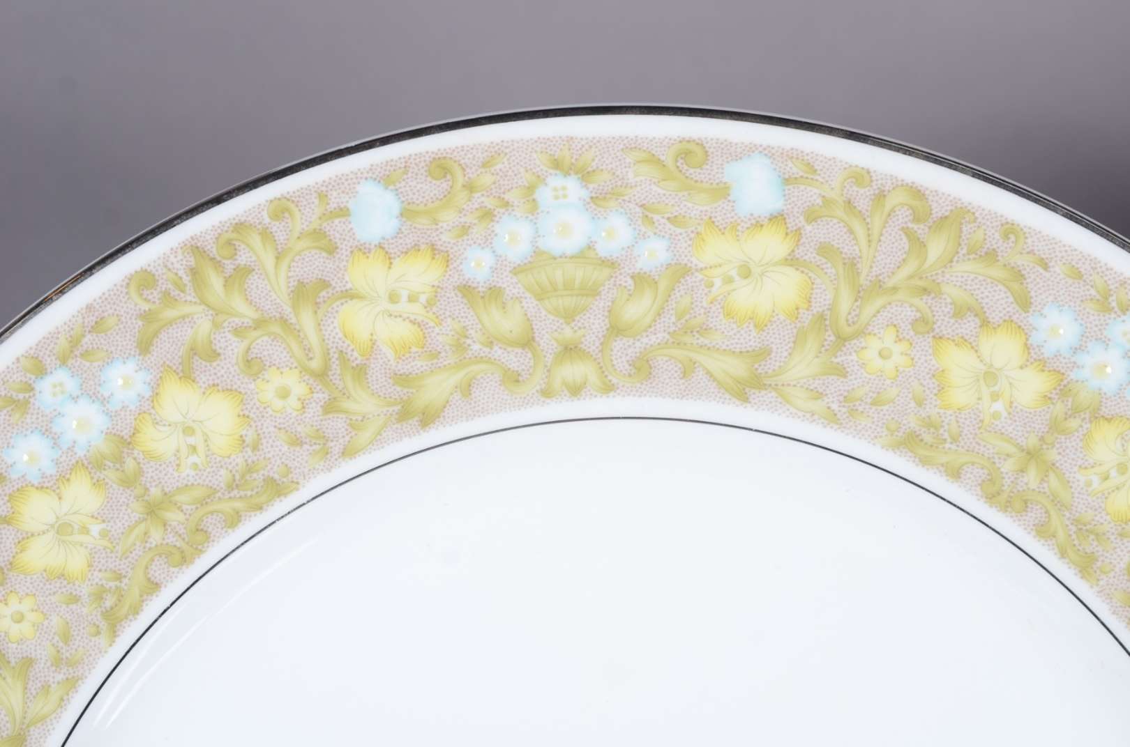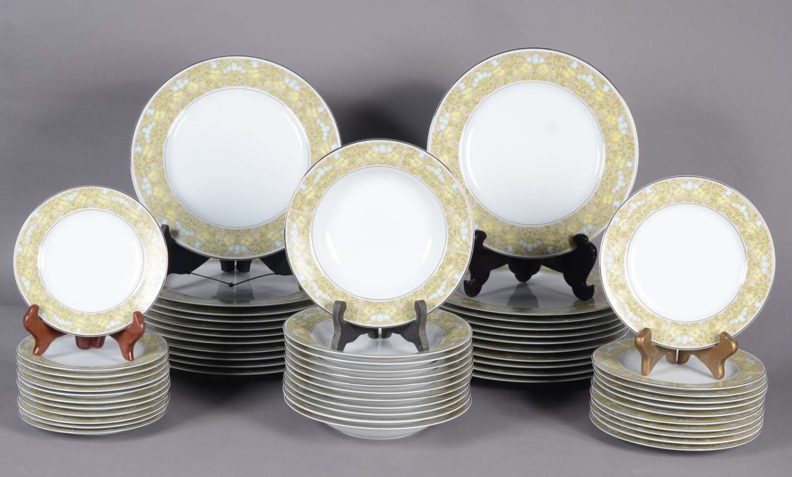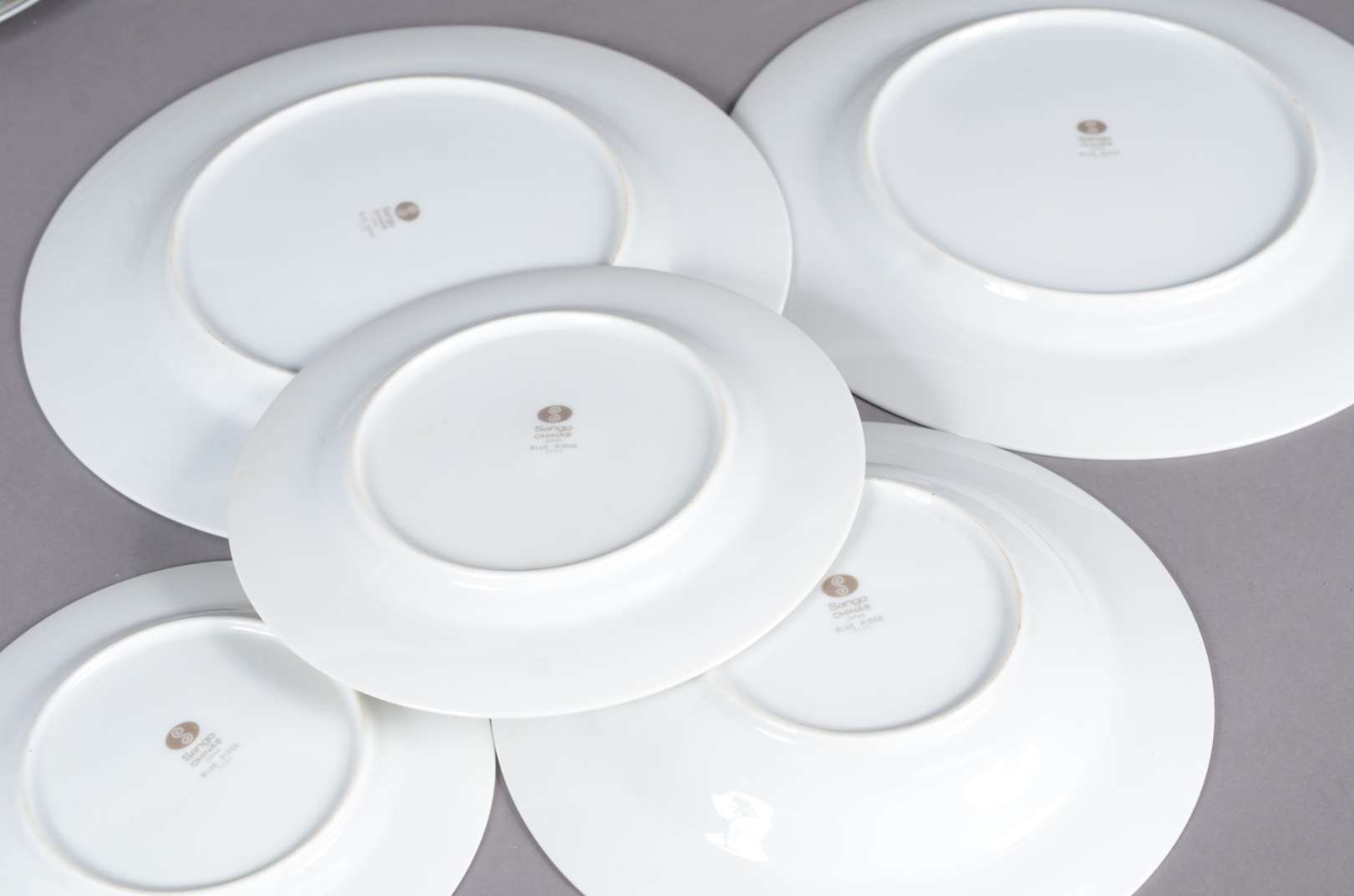 Serviço de jantar de porcelana Sango composto de: 22 pratos rasos; 12 pratos fundos; 11 pratos de sobremesa e 12 para pão. Total; 57 peças.