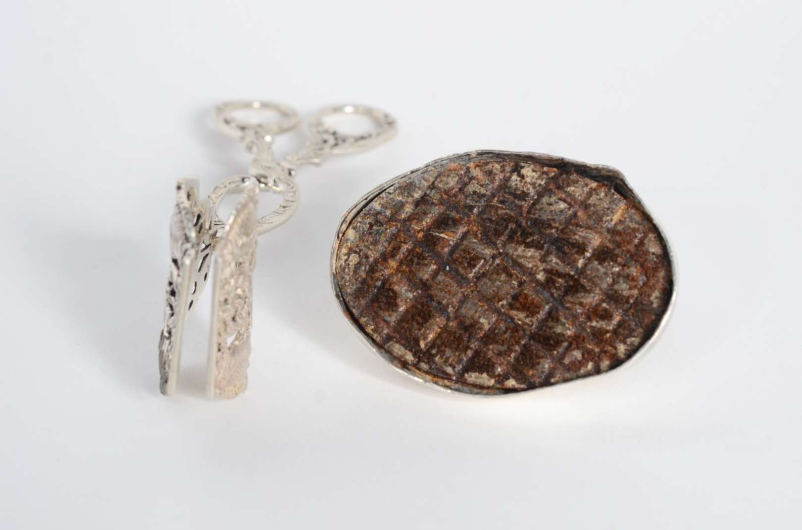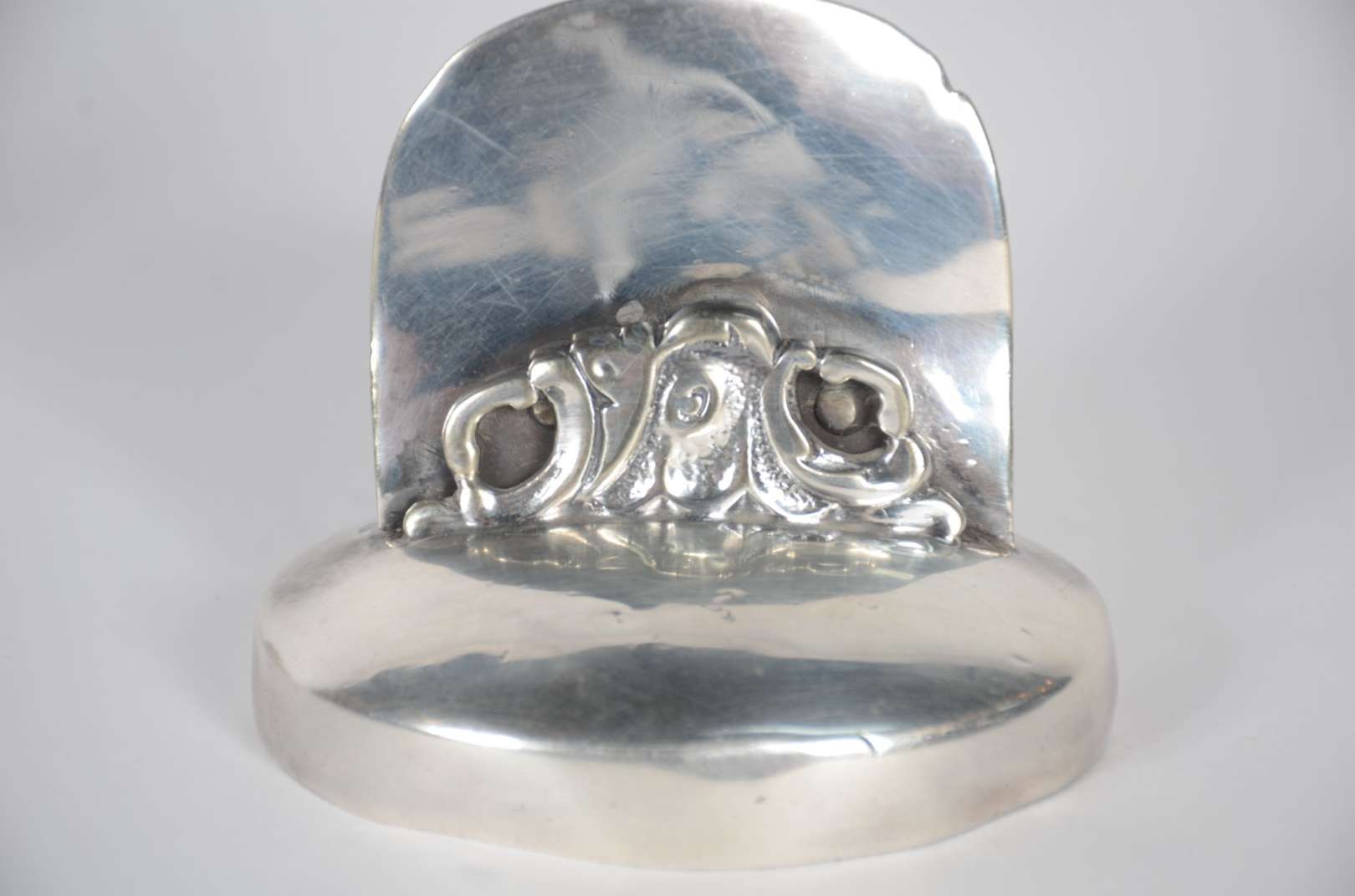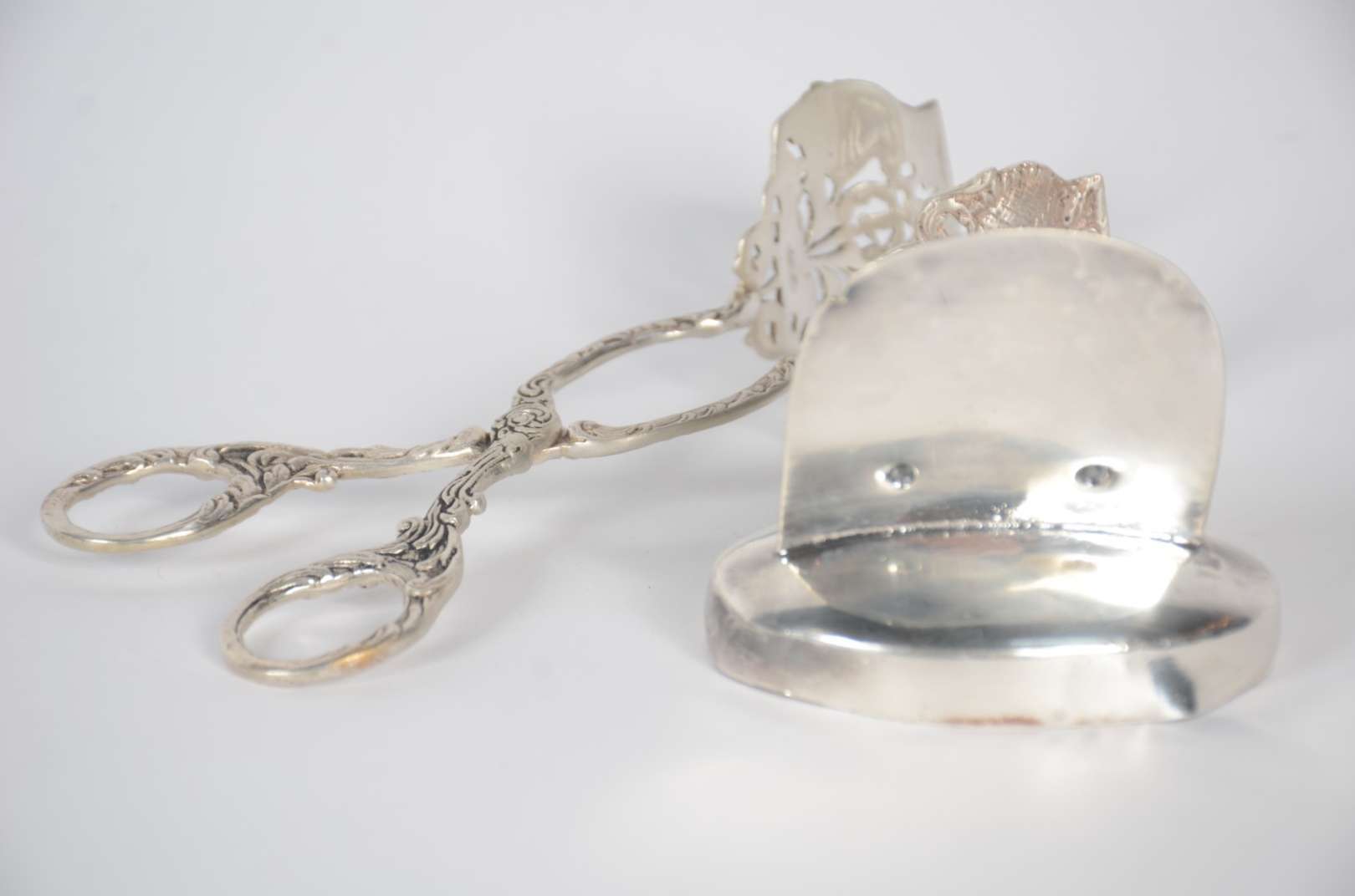 Duas peças de prata de lei, sendo: pinça para biscoitos e porta cartão. Peso total do porta cartão (com enchimento): 170g. /Peso da pinça de prata: 70 g.