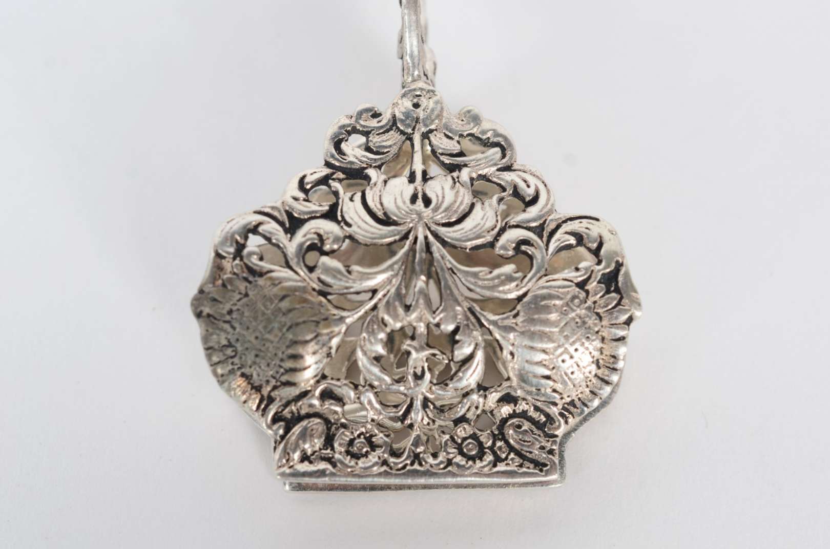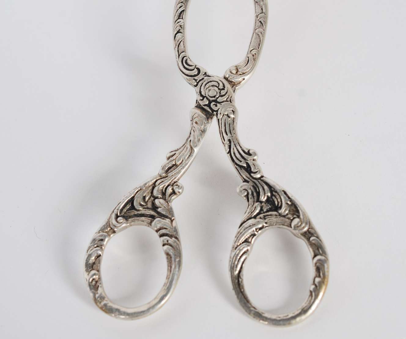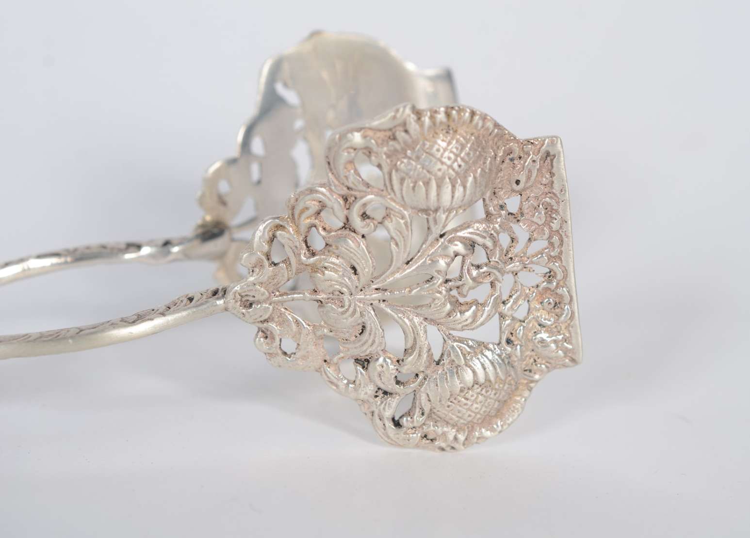 Duas peças de prata de lei, sendo: pinça para biscoitos e porta cartão. Peso total do porta cartão (com enchimento): 170g. /Peso da pinça de prata: 70 g.