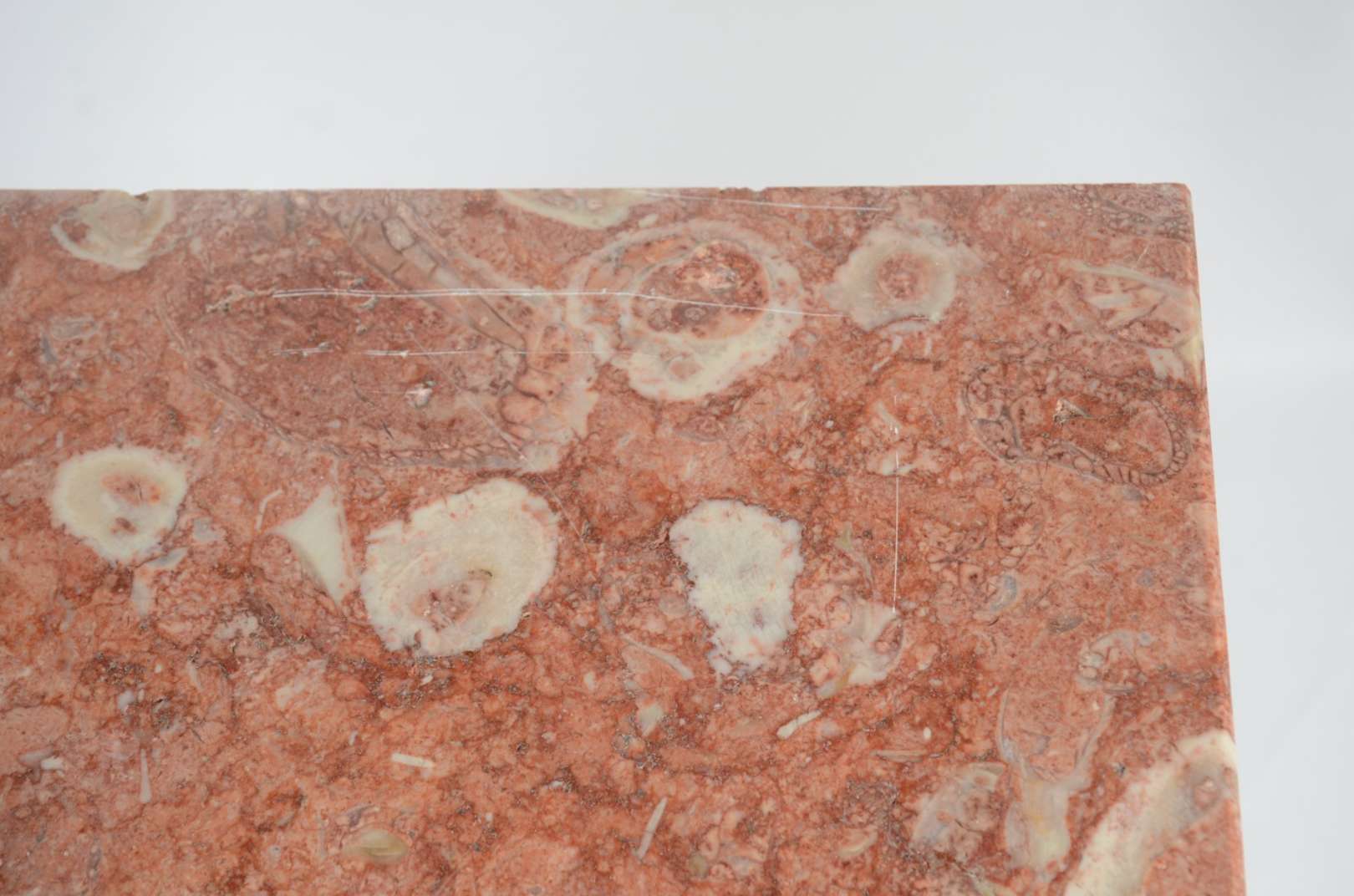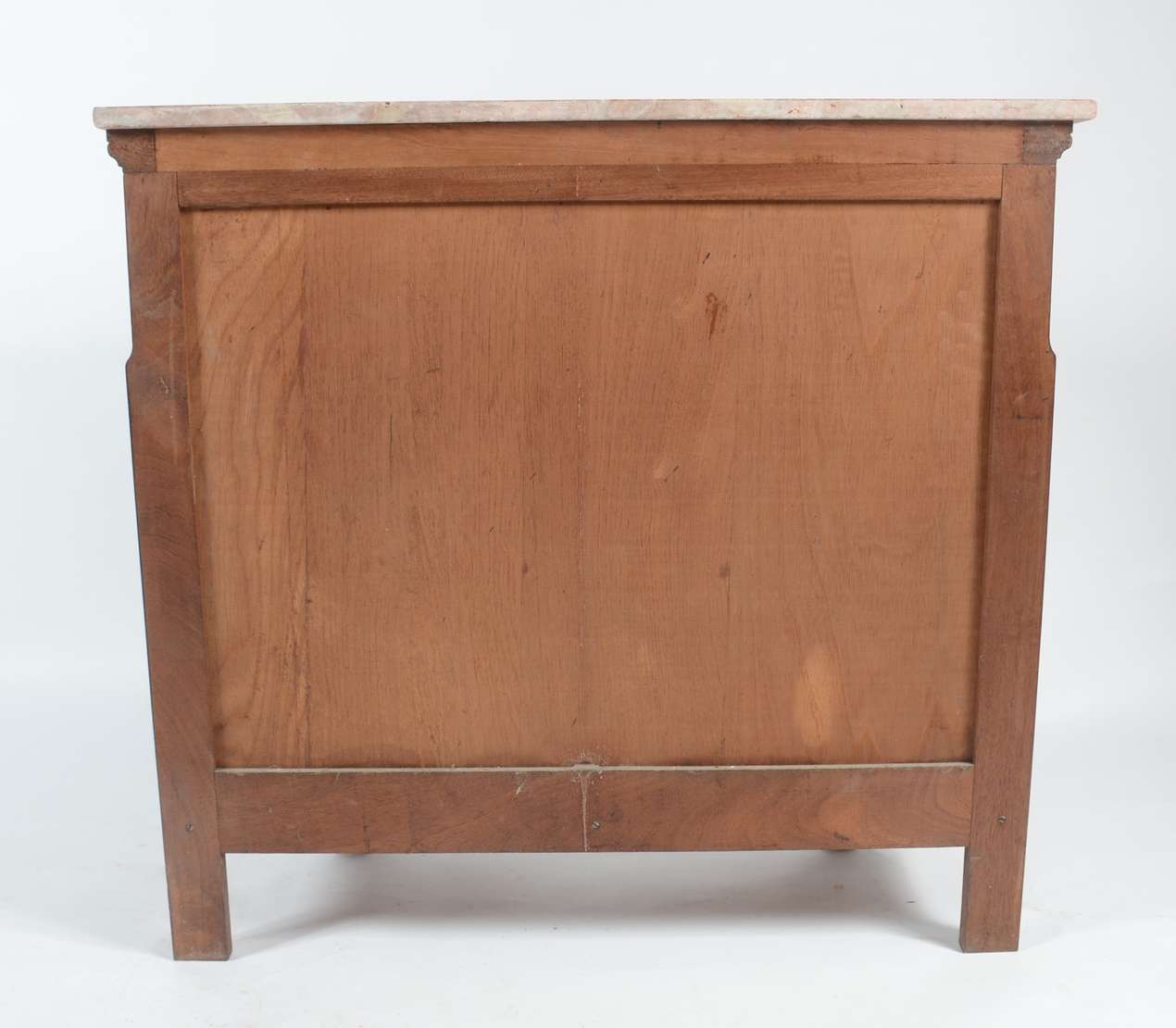 Par de criados mudos de madeira nobre com uma gaveta e porta (um deles sem puxador), tampo de mármore.