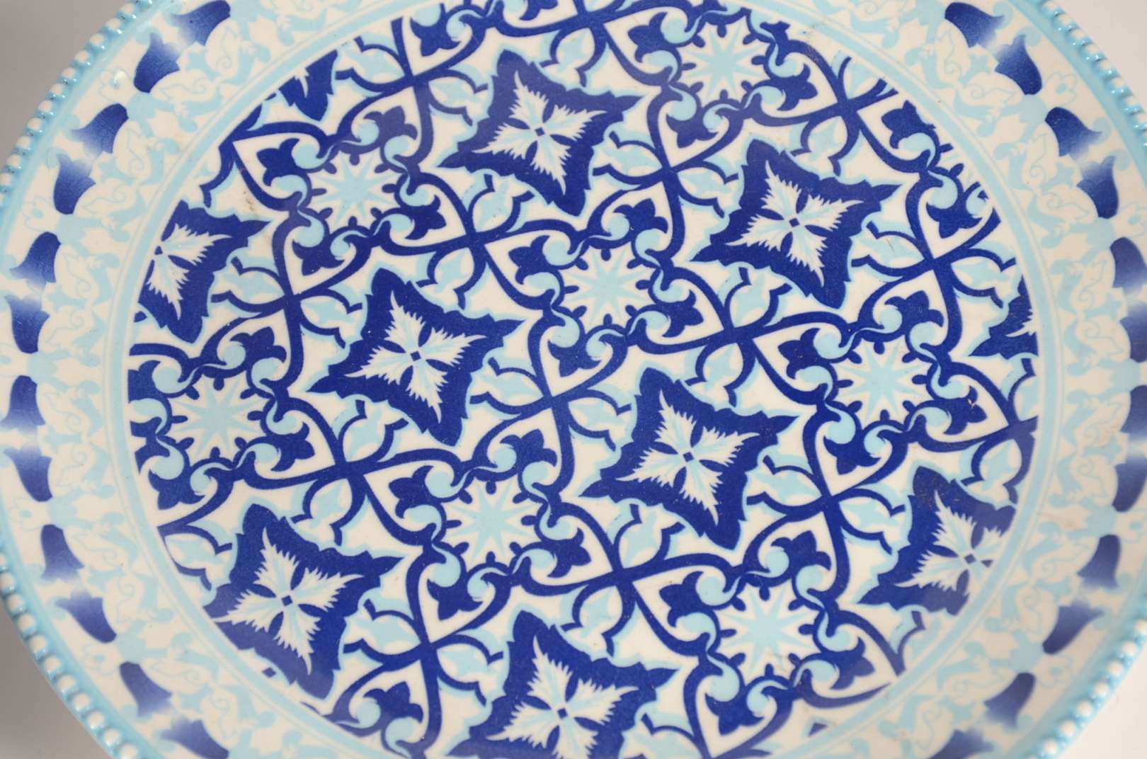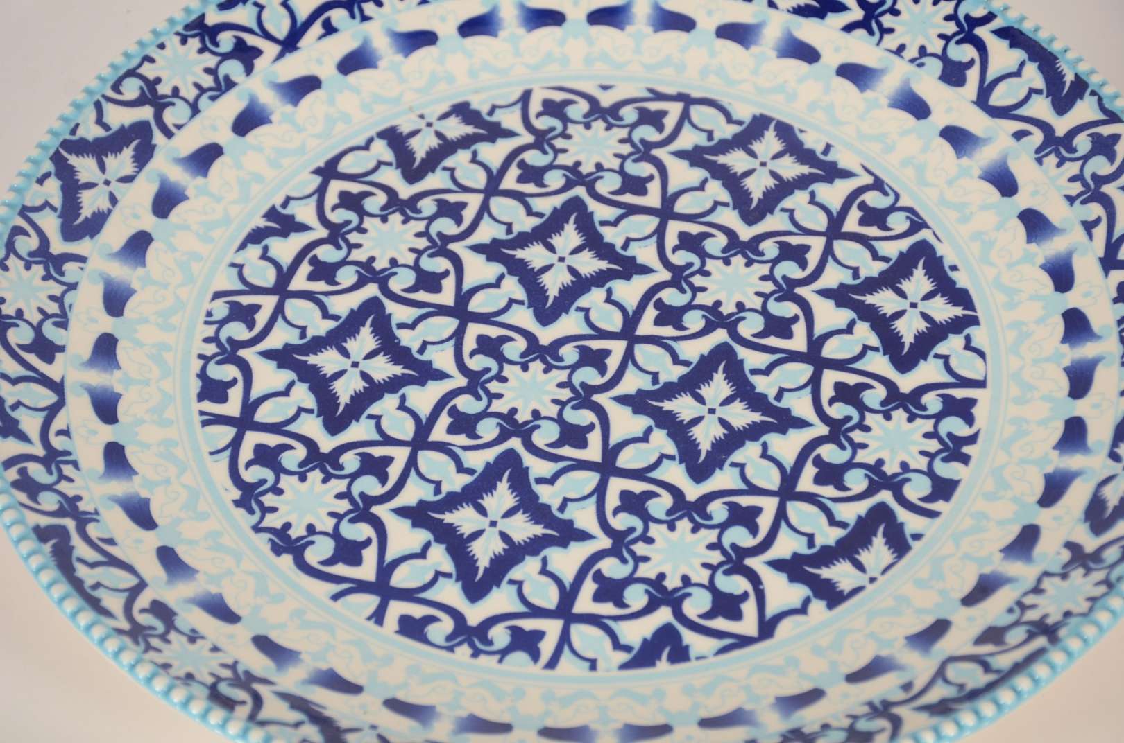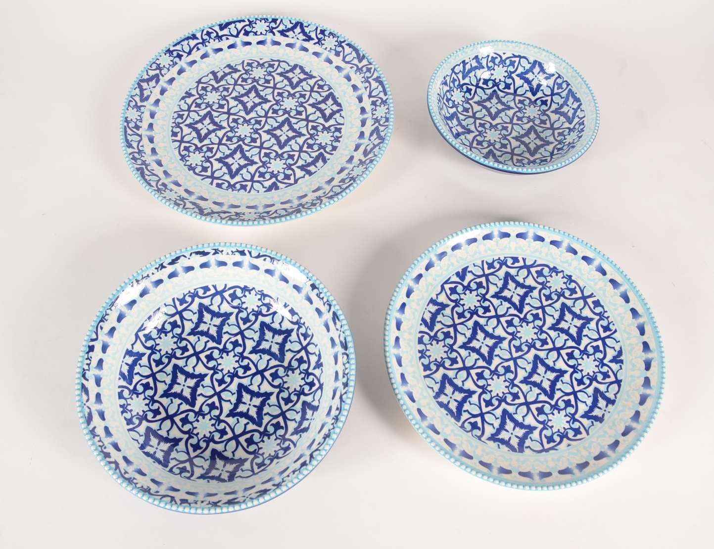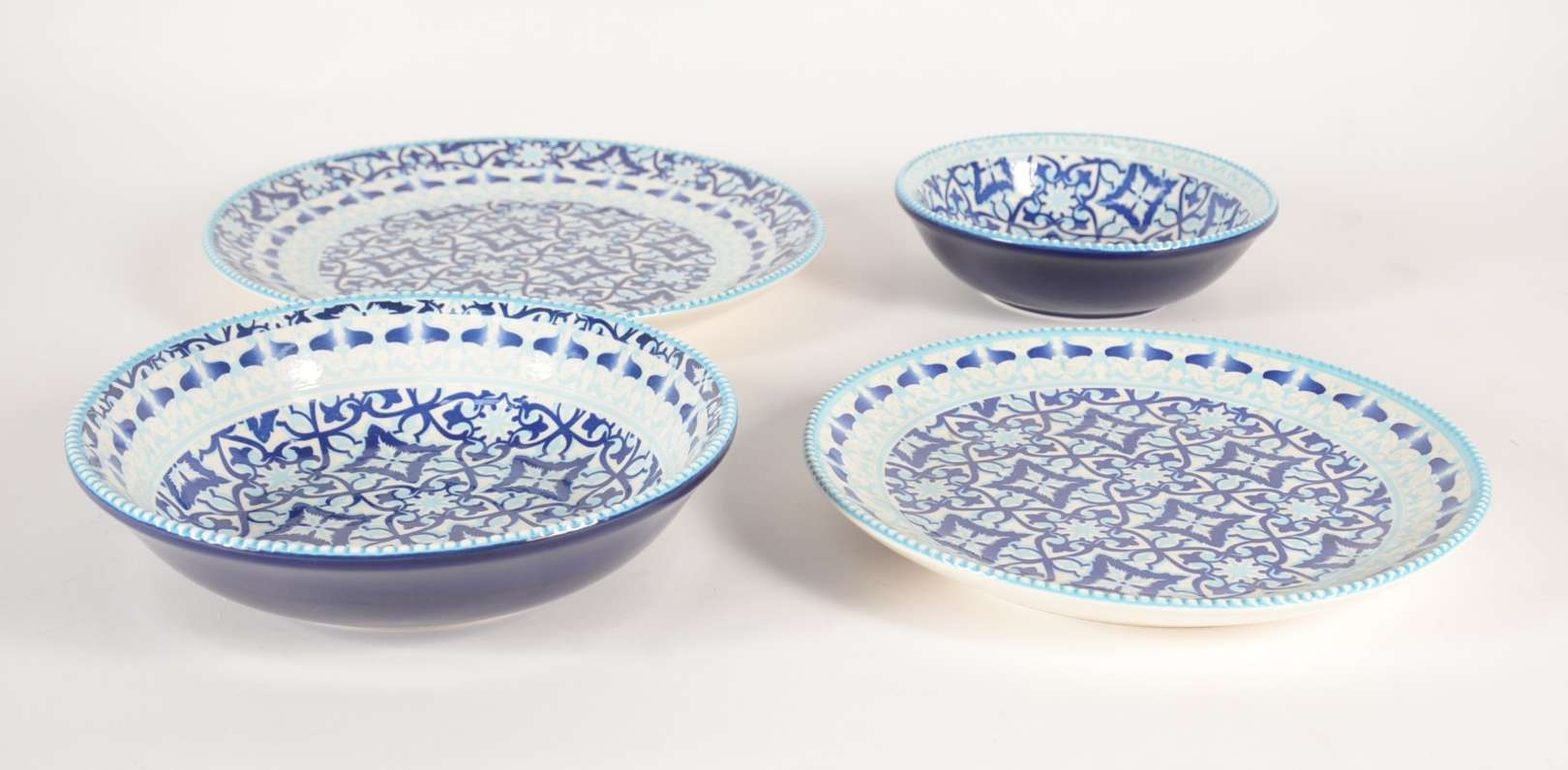 Quatro pratos de porcelana dinamarquesa, decorados com temas natalinos em azul e branco.