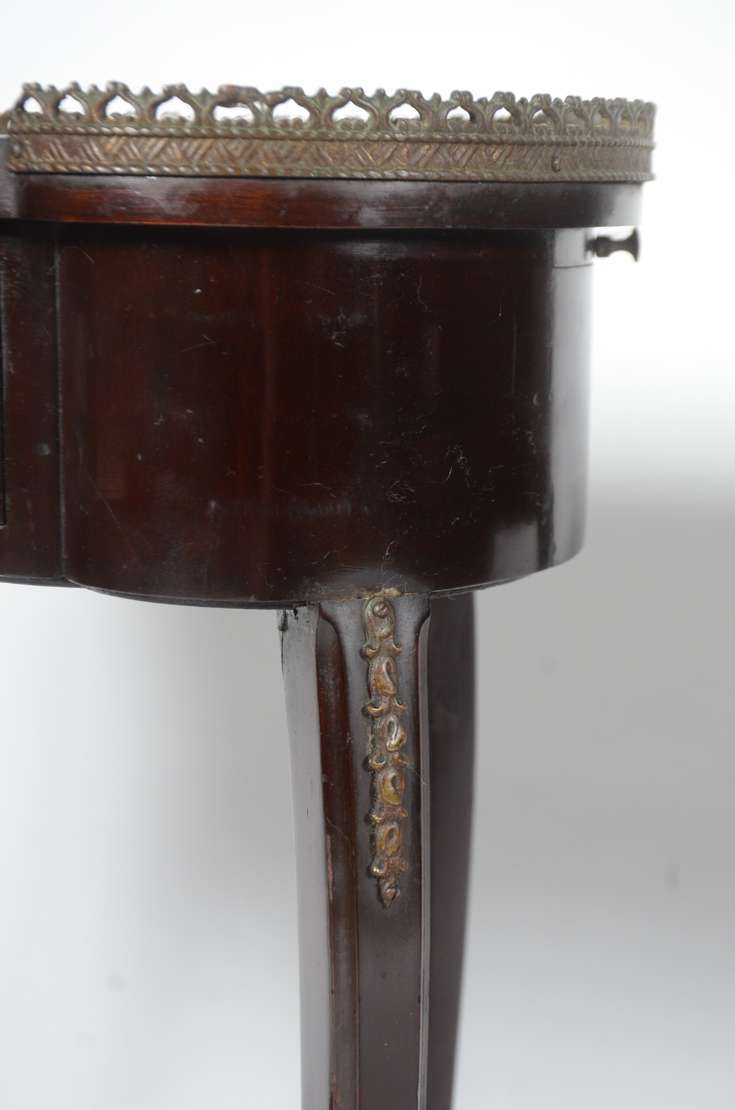 Mesa auxiliar de madeira nobre, tampo redondo com friso marquetado, mármore sobreposto com figura de ave em policromi...