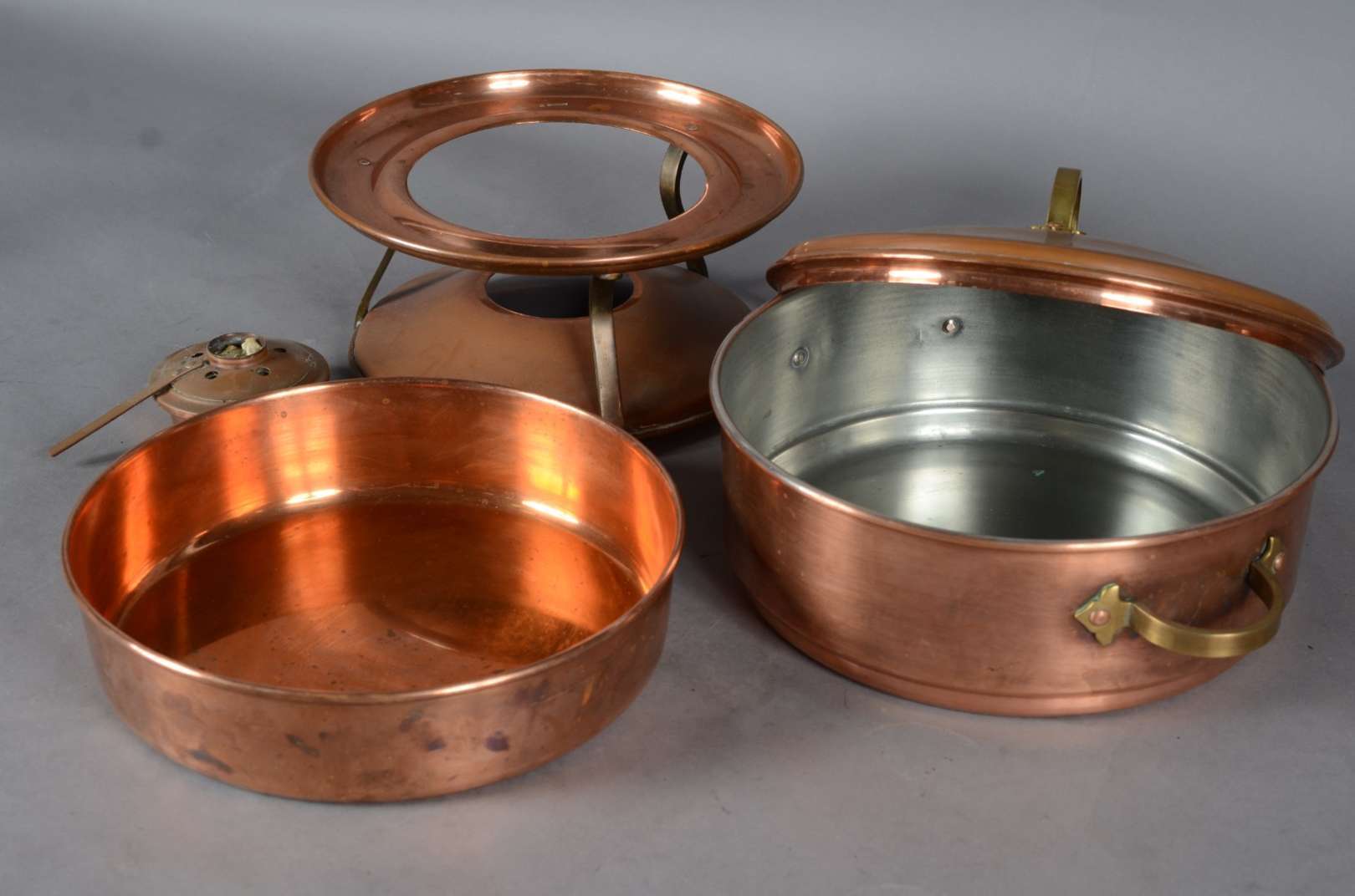 Cinco peças diversas de metal prateado, sendo: 2 travessas redondas e 3 bases para pirex.