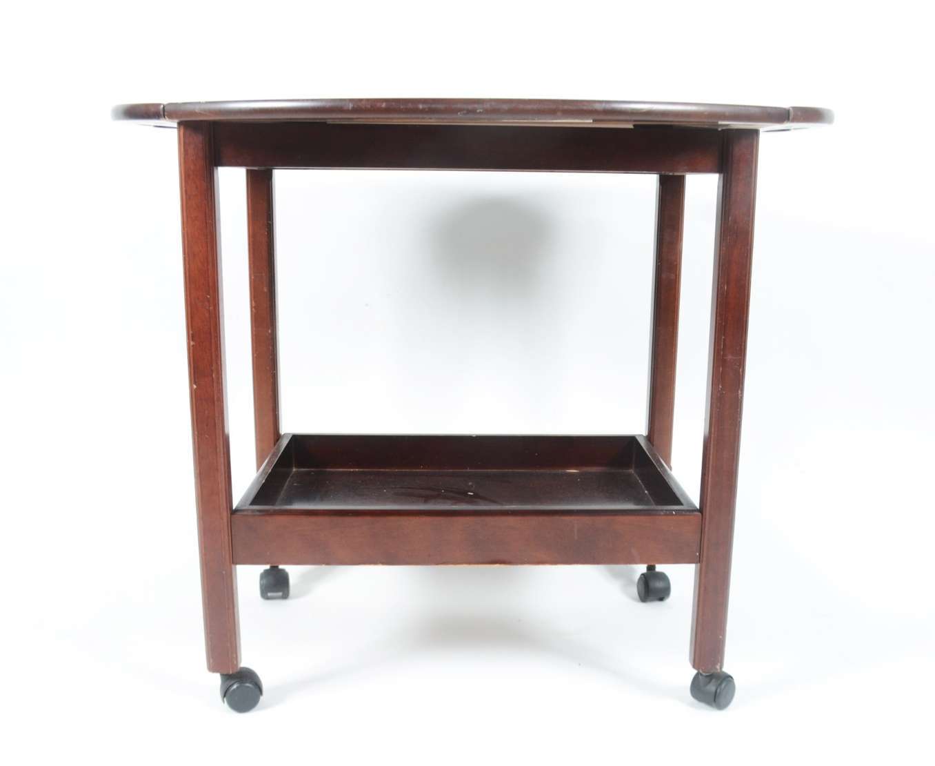 Par de mesas auxiliares de madeira nobre, feitio redondo com bordas trabalhadas, bases em coluna central terminando e...