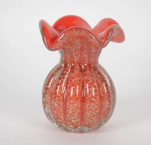Vaso de vidro decorativo na cor vermelha com pó de ouro, trabalhado em gomos.