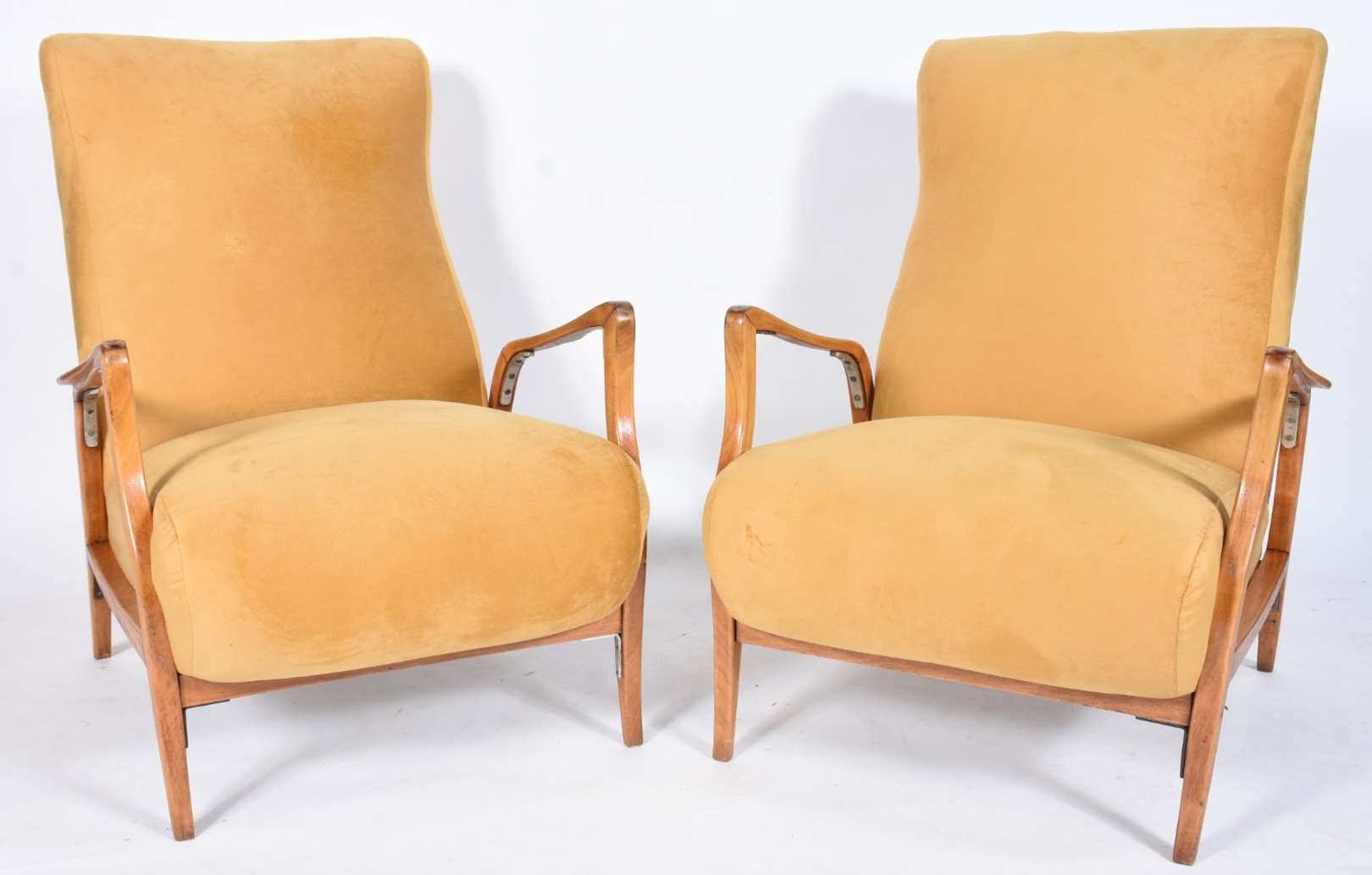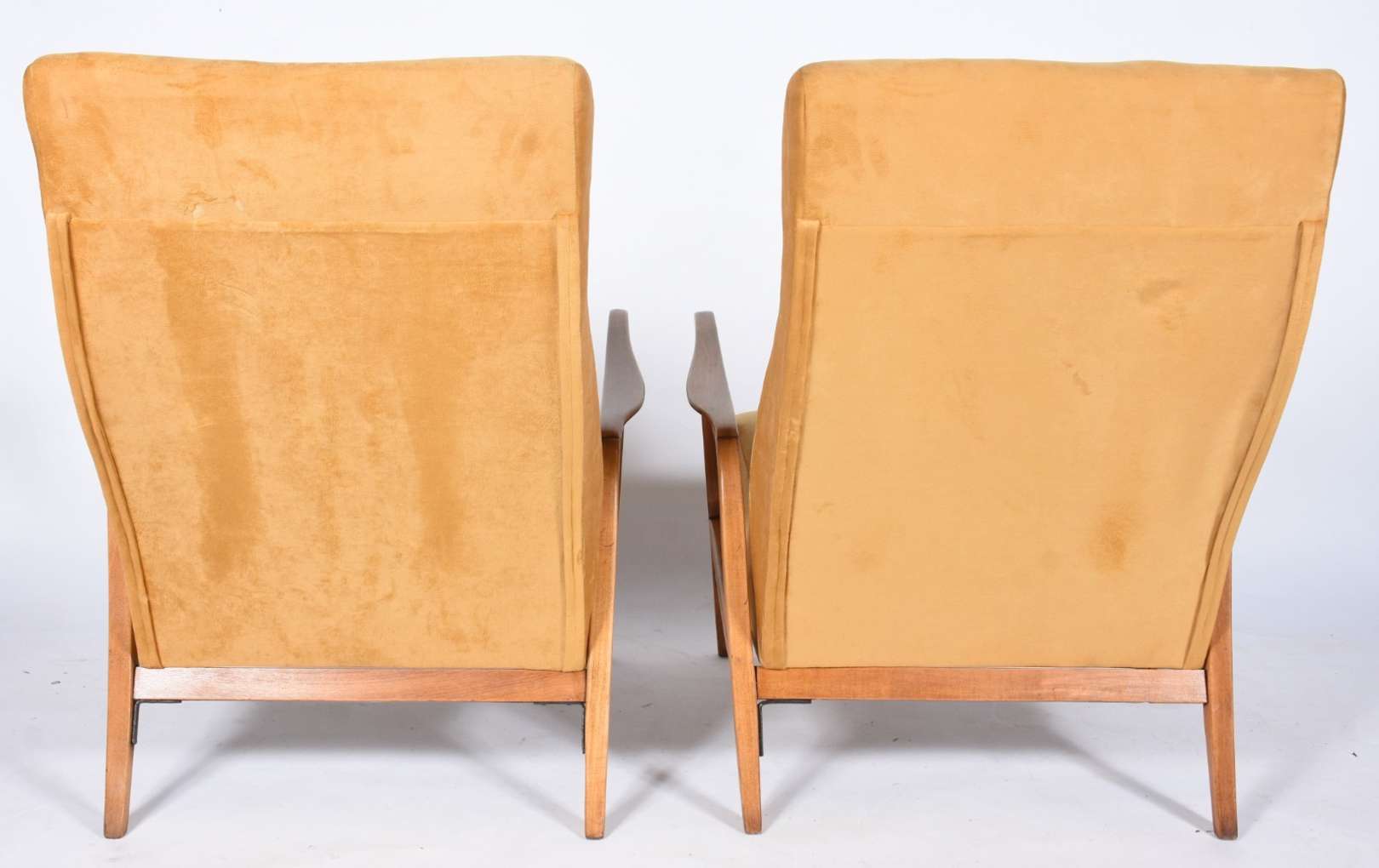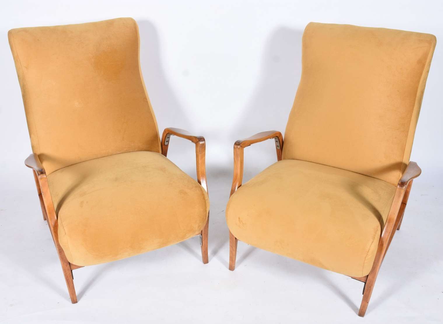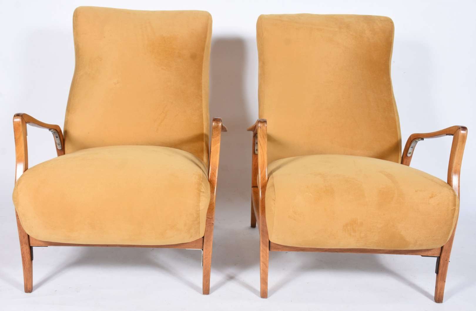 Par de poltronas de madeira nobre com estofamento forrado com tecido na cor mostarda, anos 50.