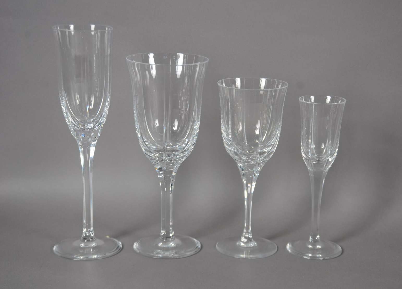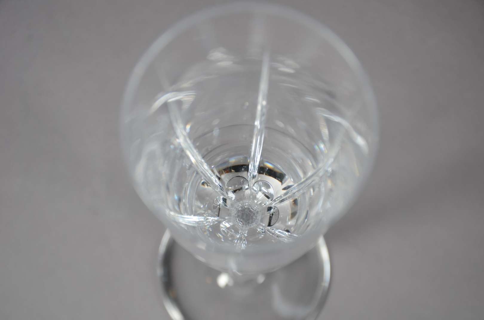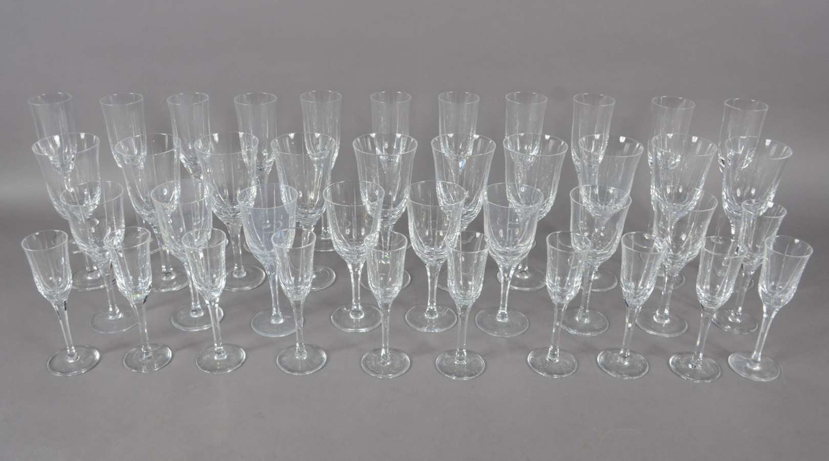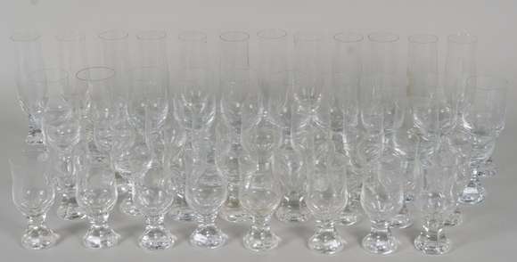 Serviço de cristal composto de: 12 flutes, 12 para água, 12 para vinho branco, 10 para vinho tinto. Total: 46 peças.