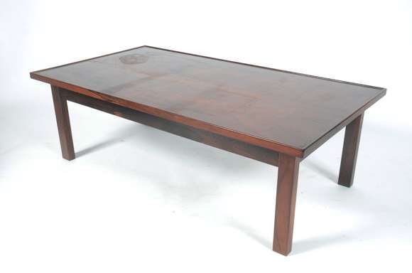 Mesa de centro de madeira nobre, tampo retangular, quatro pernas retas.