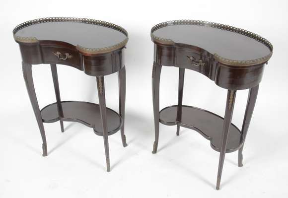 Par de mesinhas laterais de madeira nobre feitio rim, uma gaveta cada, platôs inferiores, gradinha de metal.