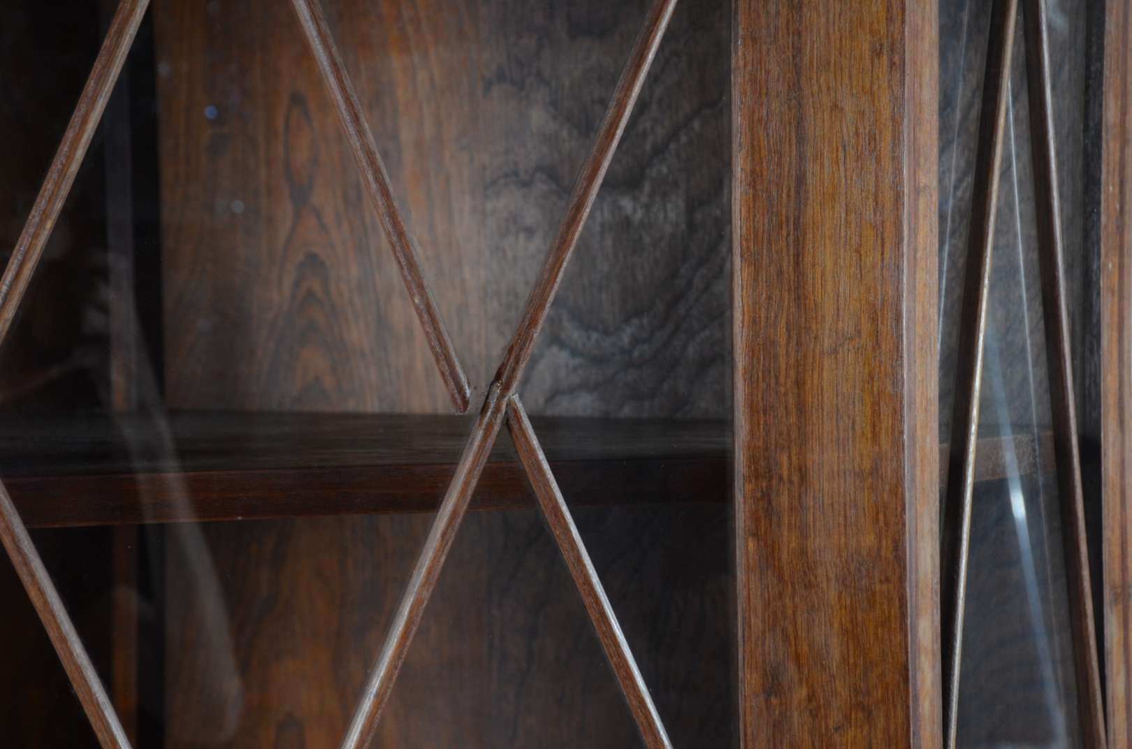 Par de mesas laterais de madeira nobre com uma gaveta cada, pernas em forma de liras ligadas por traves horizontais.
