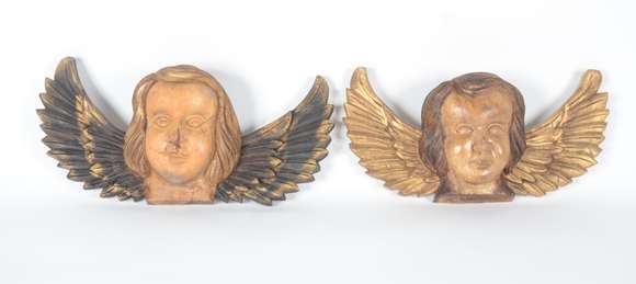 Par de cabeças de anjos de madeira entalhada e realces dourados.