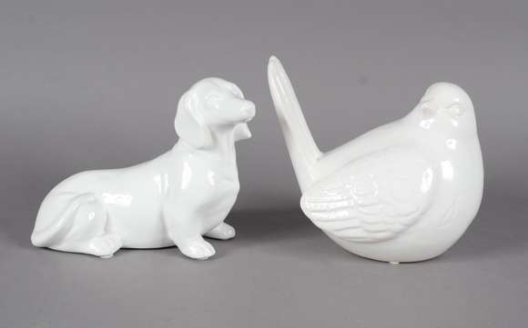 Duas peças de cerâmica, sendo pombo e cachorro.