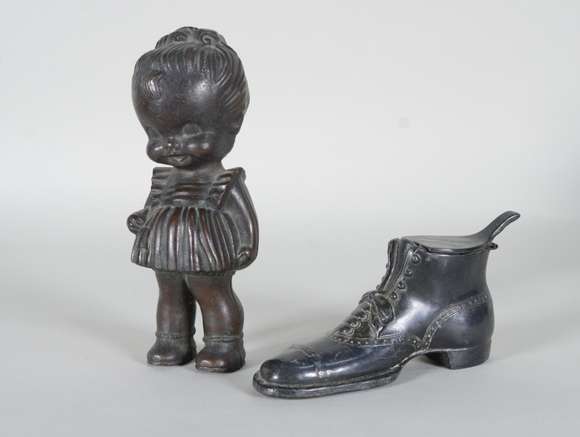 Duas esculturas, sendo: sapato de metal e menina de bronze.