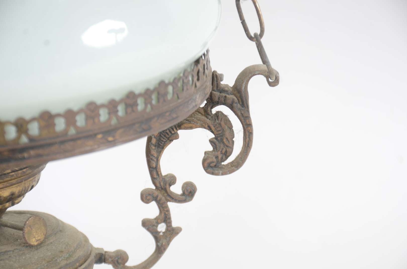 Duas peças de metal, sendo: luminária policromada representando casal, cinco mangas de vidro fosco com detalhes na co...