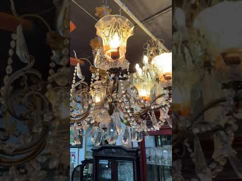 Lustre de metal dourado estilo Versailles, para 8 luzes, placas na cor esverdeada lapidadas.