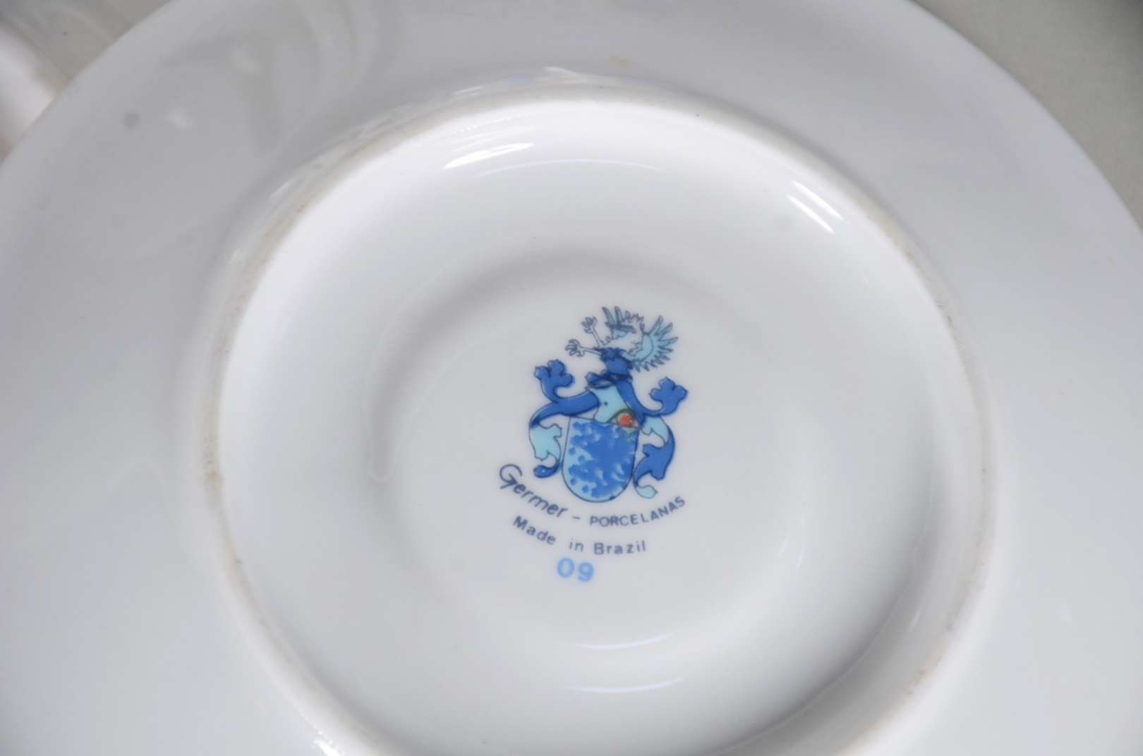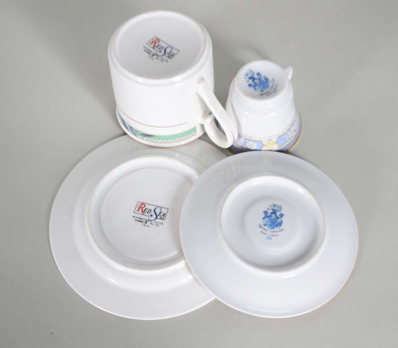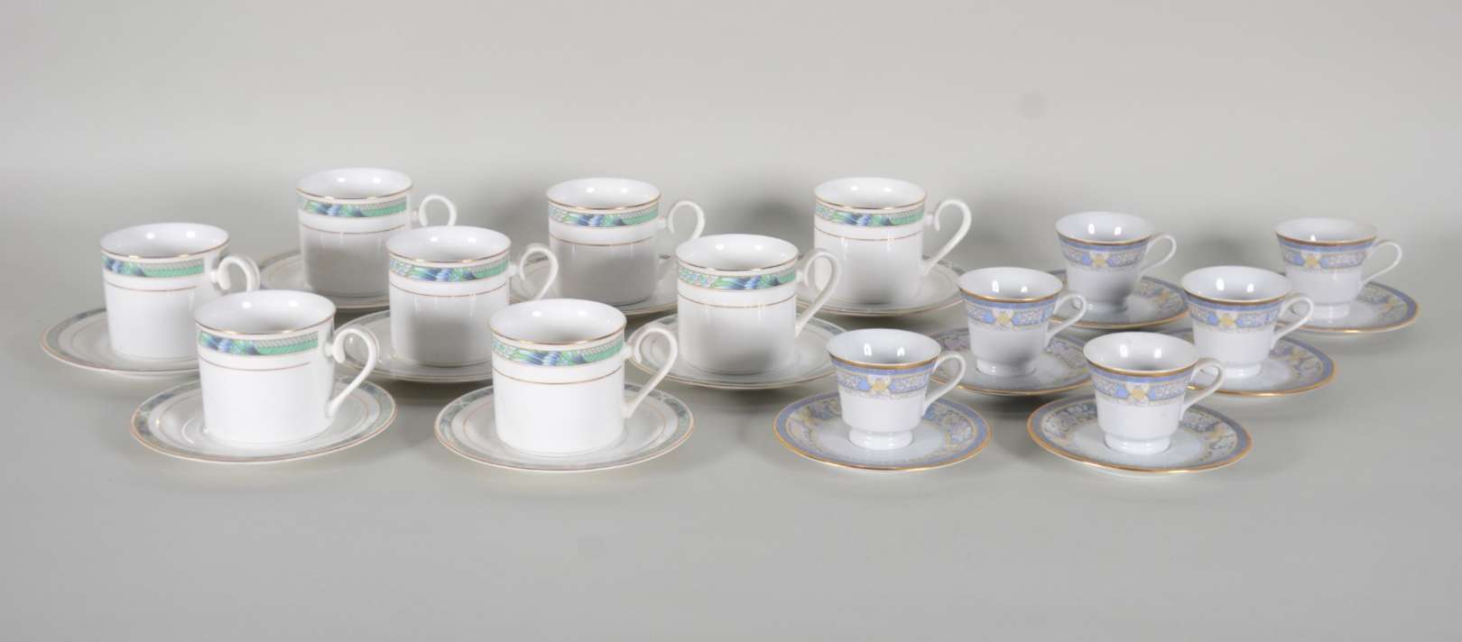 Dois conjuntos de xícaras de porcelana, sendo um "Red Sea" para chá com 8 xícaras com pires; e outro "Germer" com 6 xícaras de café com pires. Total 14 peças.
