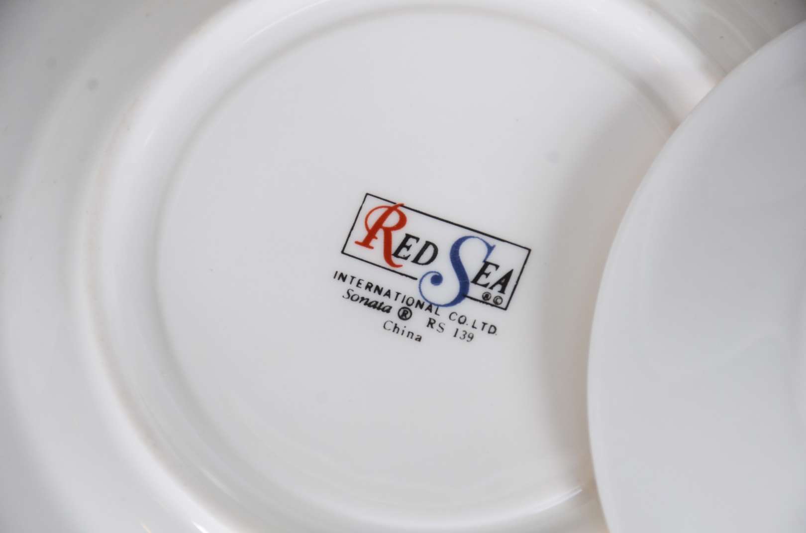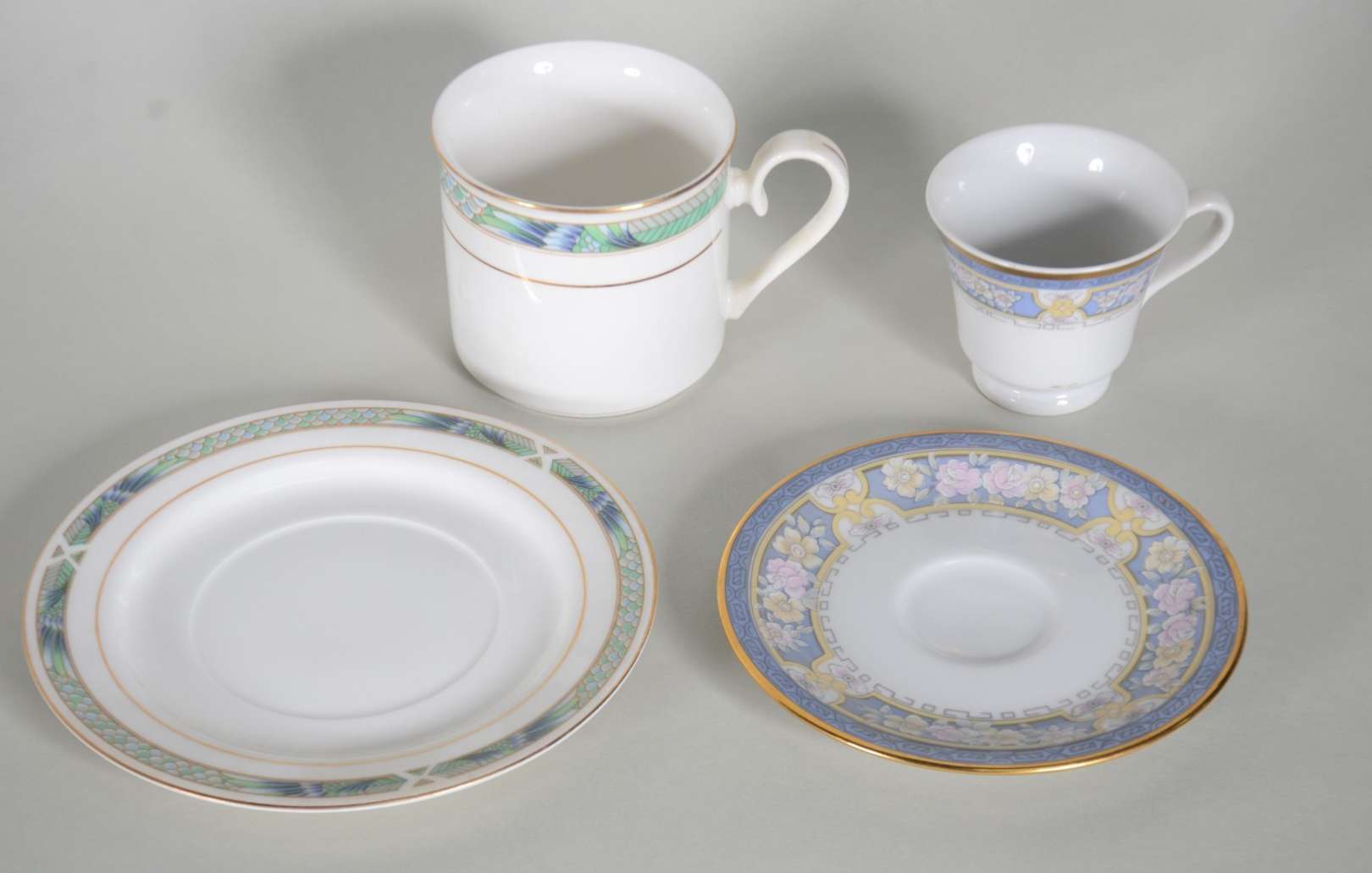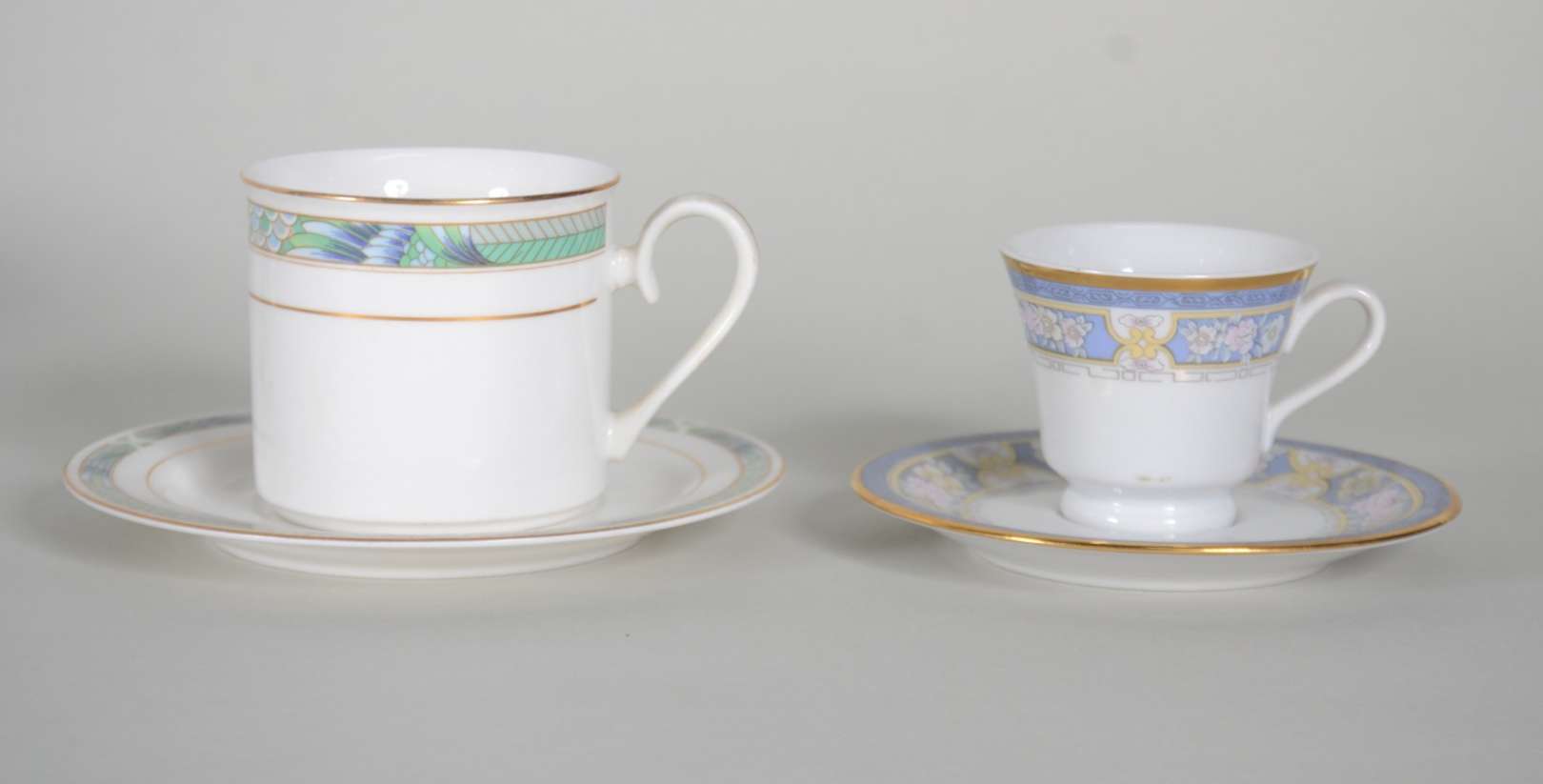 Dois conjuntos de xícaras de porcelana, sendo um "Red Sea" para chá com 8 xícaras com pires; e outro "Germer" com 6 xícaras de café com pires. Total 14 peças.