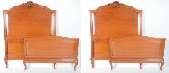 Par de camas de solteiros de madeira nobre, completa com laterais e estrado. Estilo Chipendale.