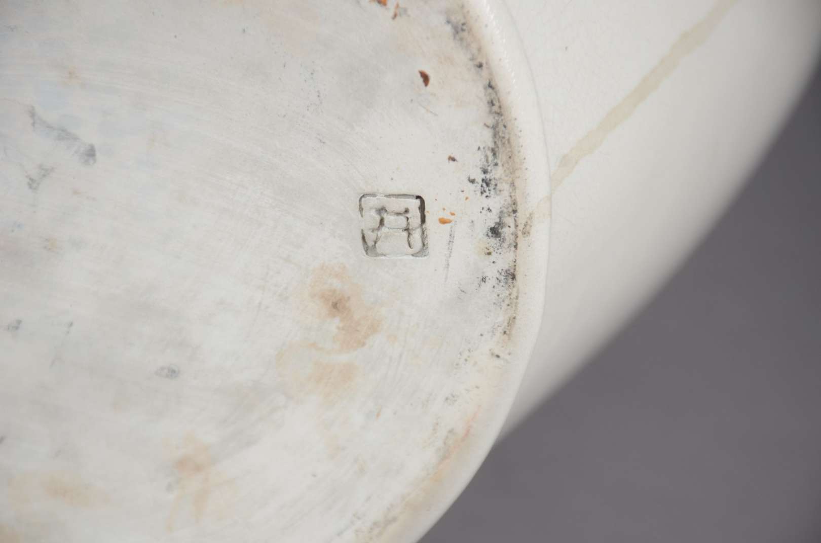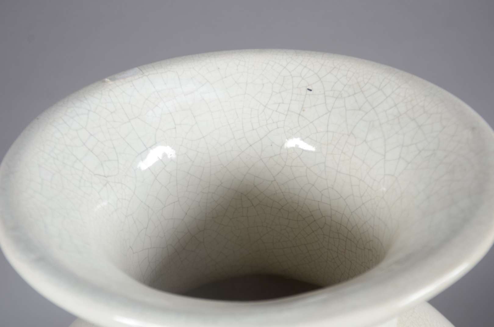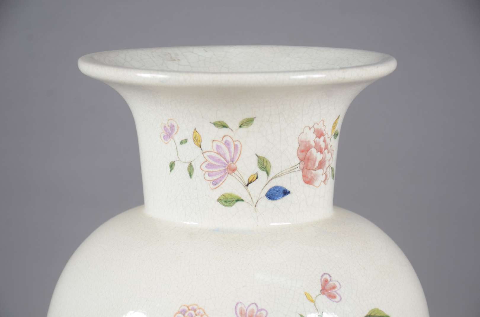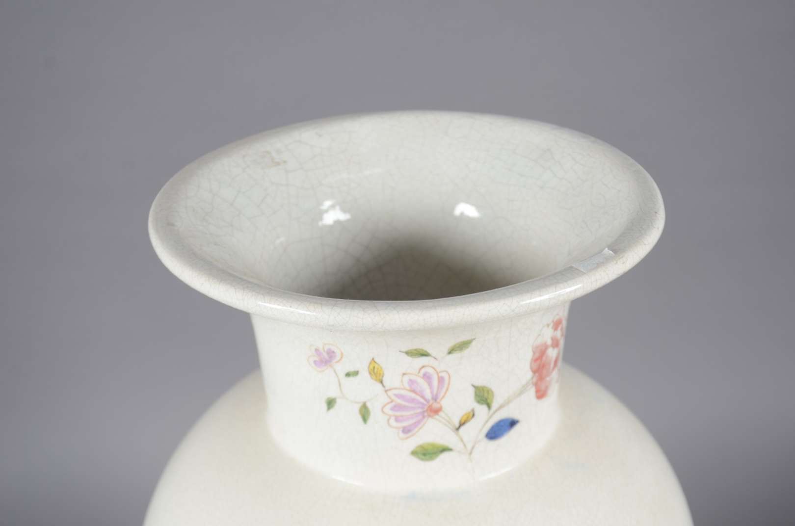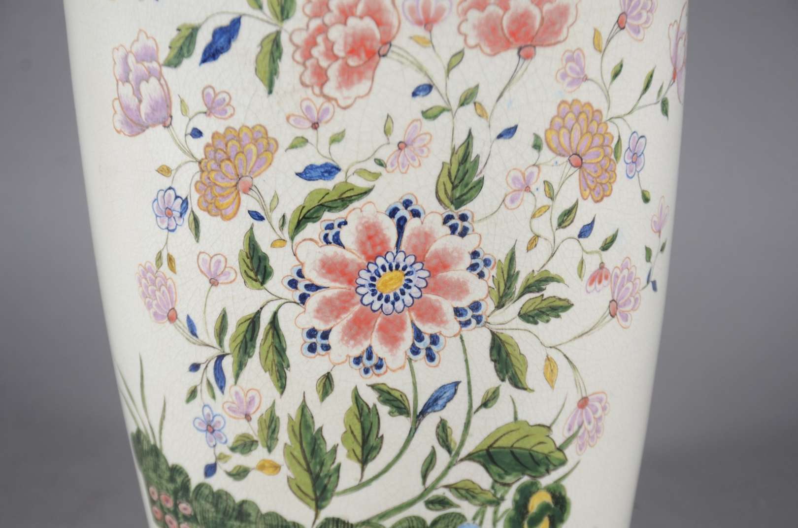 Cachepot de porcelana craquelê com flores e gregas em tons de rosa.