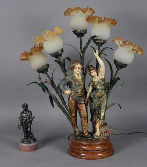 Duas peças de metal, sendo: luminária policromada representando casal, cinco mangas de vidro fosco com detalhes na co...
