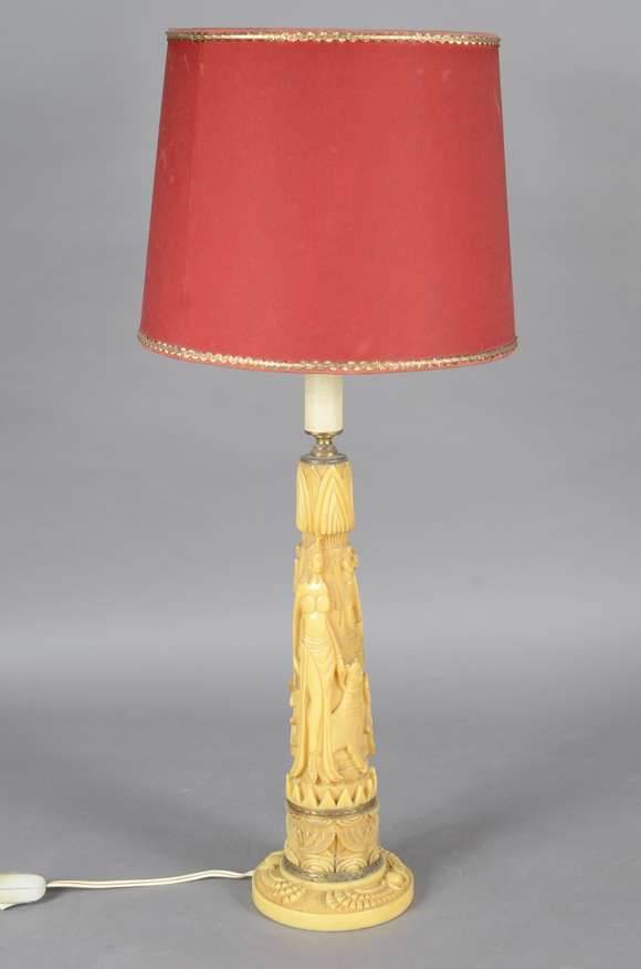 Abatjour de resina decorado com figuras egípcias e animais. Acompanha cúpula na cor vermelha.