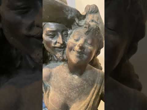 Duas esculturas, sendo: sapato de metal e menina de bronze.