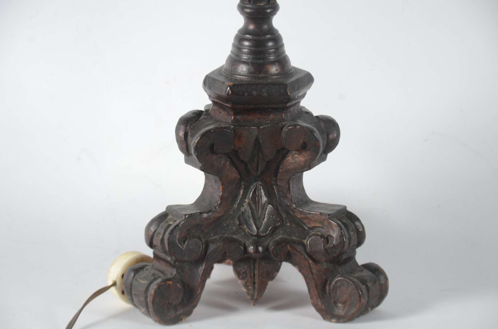 Abatjour de cerâmica na cor mostarda, pequenos bicados na borda. Base de madeira, pequeno bicado.