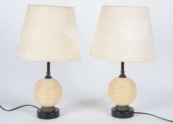 Par de abatjoures modernos de metal pintado e "bolas" de cerâmica. Acompanham cúpulas na cor bege. Desgastes.