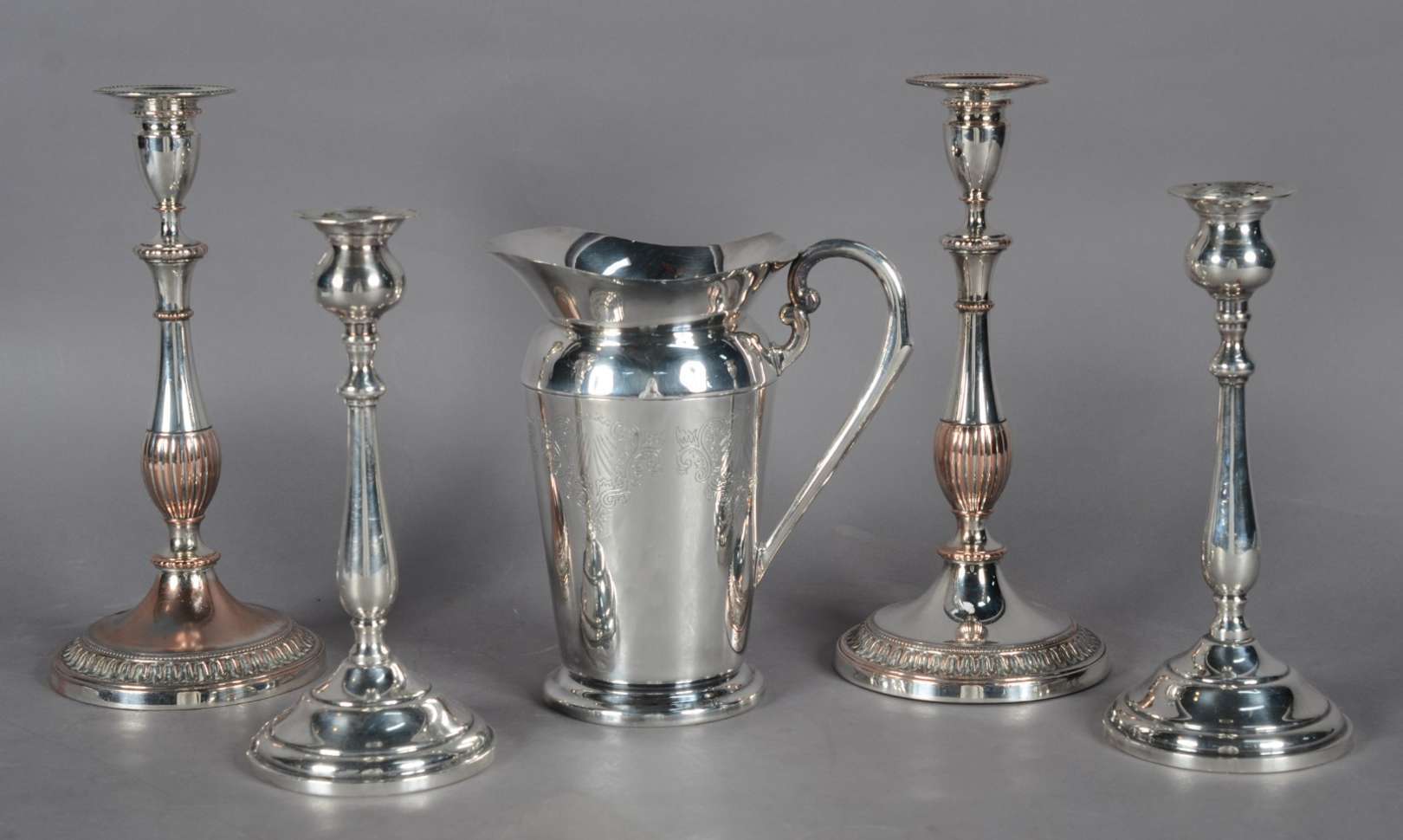 Cinco peças diversas de metal prateado, sendo: 2 travessas redondas e 3 bases para pirex.