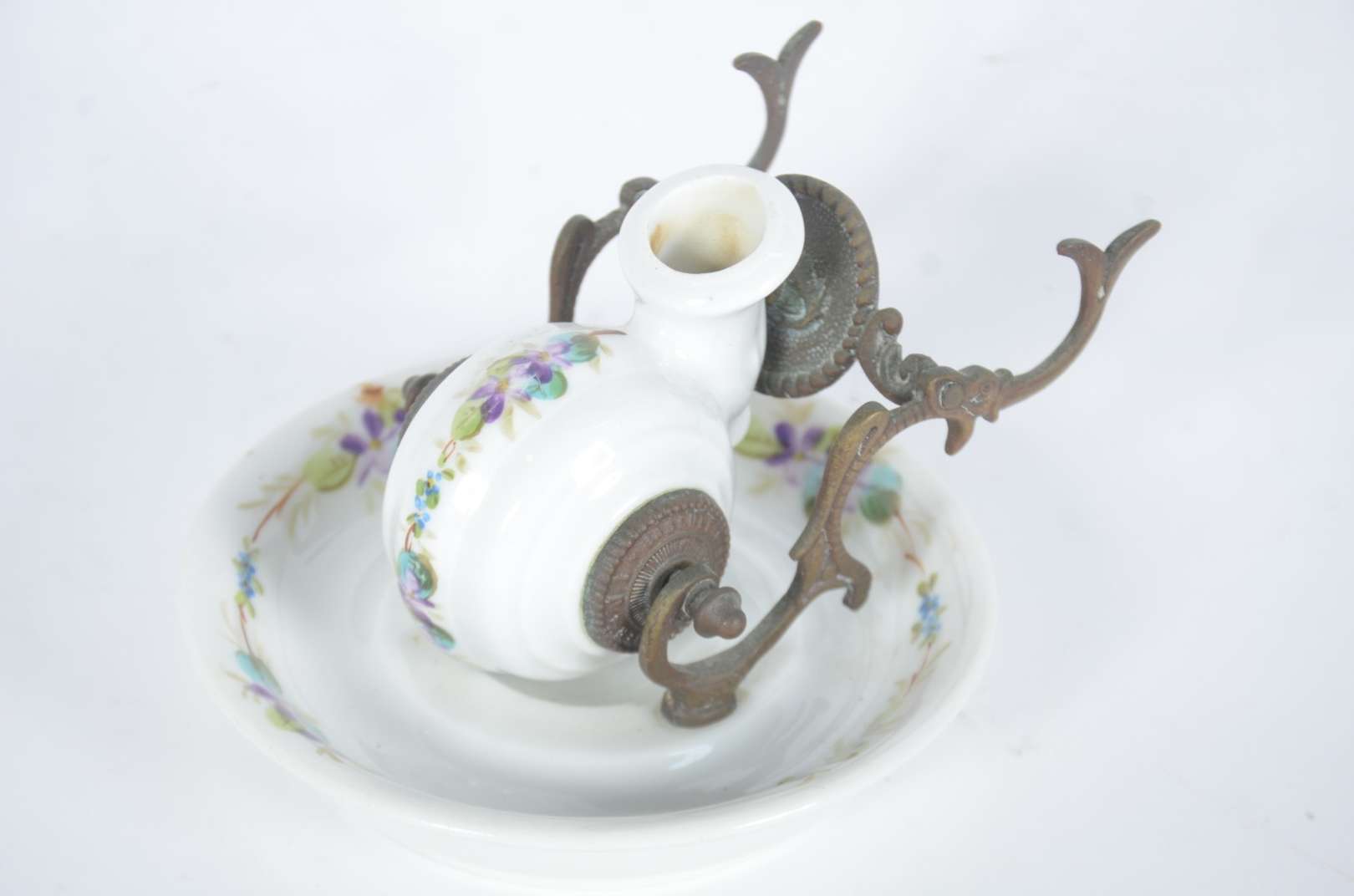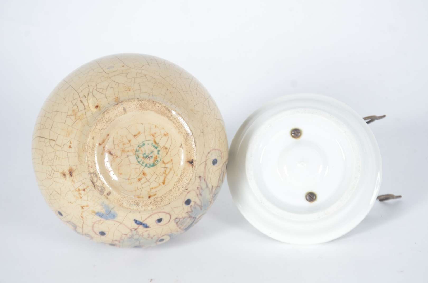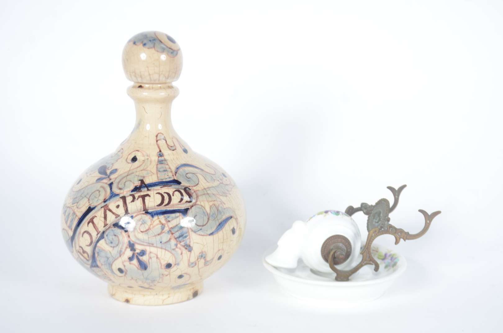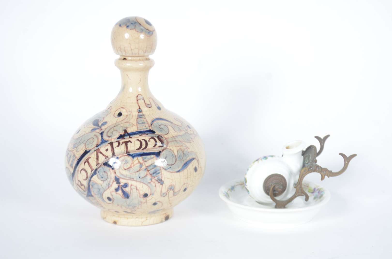 Diversas peças, sendo: 2 recipientes para tinta de vidro com tampas de metal (modelos diferentes); 2 cachimbos com po...