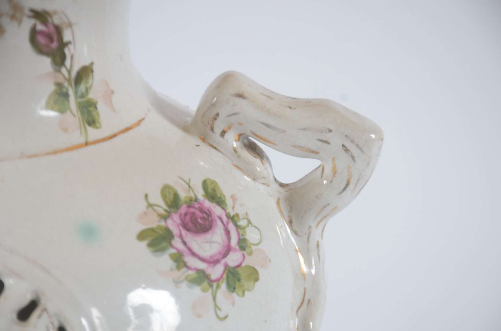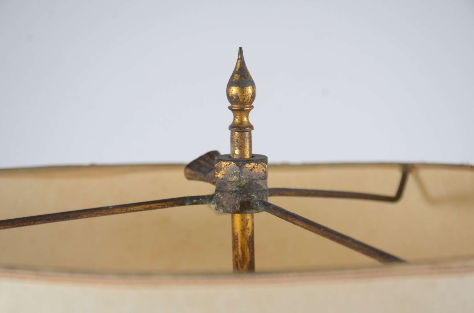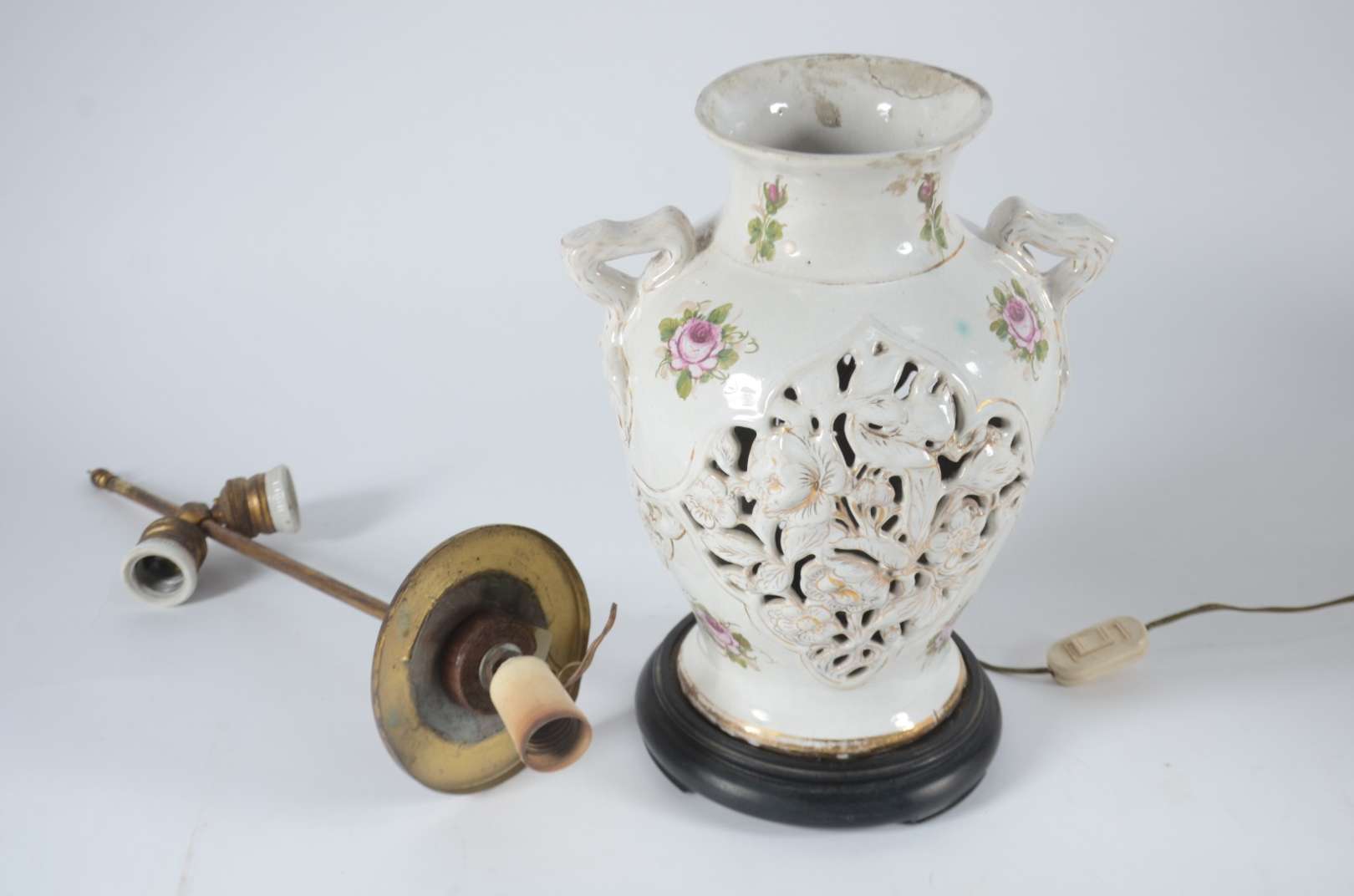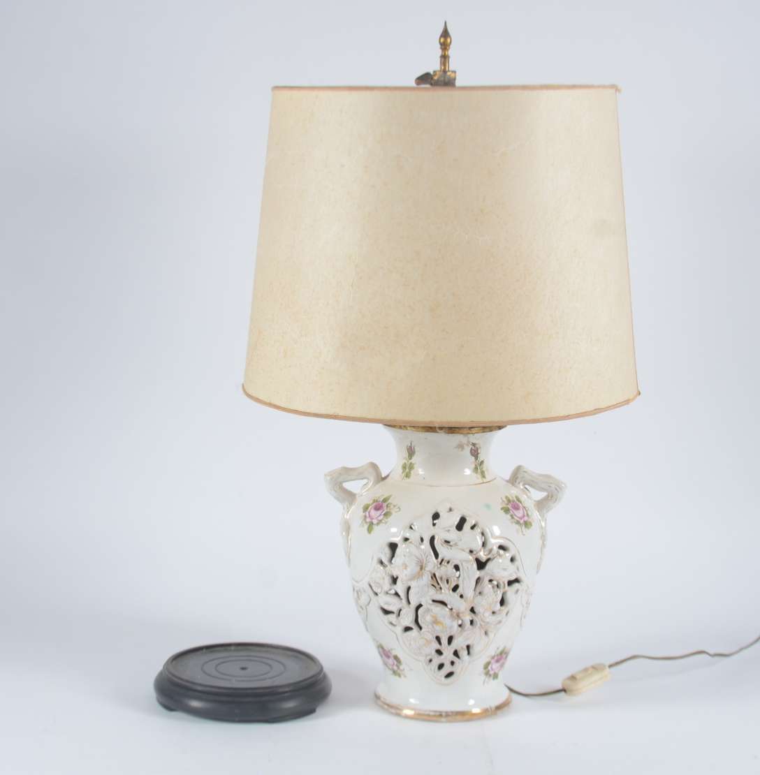 Duas peças de metal, sendo: luminária policromada representando casal, cinco mangas de vidro fosco com detalhes na co...
