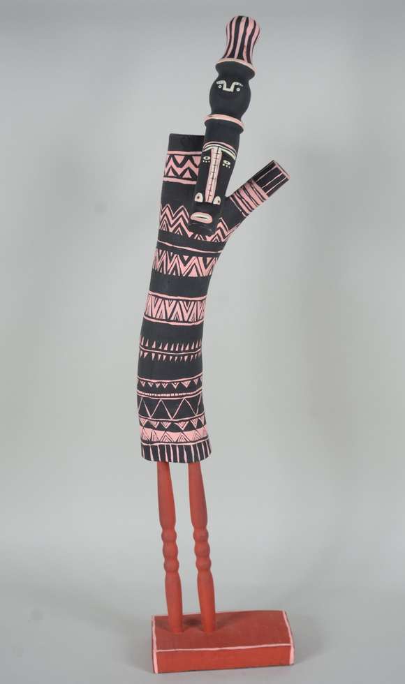 Totem esculpido em madeira, com pintura em motivo indígena.