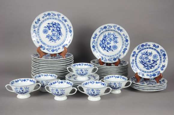Serviço de jantar de porcelana Steatita, decoração "cebolinha" em azul e branco, composto de: 14 pratos rasos, 10 pra...