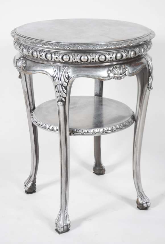 Mesa redonda de madeira nobre patinada de prateado, saia recortada, quatro pernas ligeiramente recurvas unidas por pl...