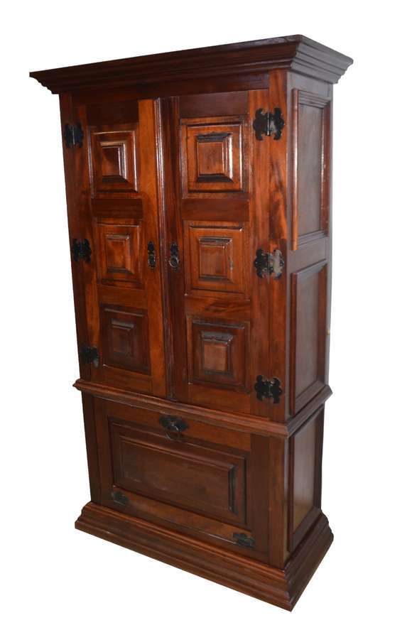 Armário de madeira nobre, estilo colonial brasileiro. Parte inferior com tampo frontal articulado, alçada com duas po...