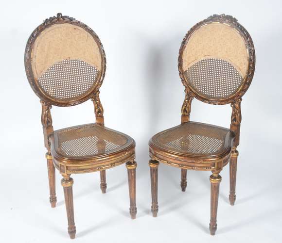Par de delicadas cadeiras de madeira nobre com pátina dourada, assentos e encostos de palhinha com detalhes de tecido...