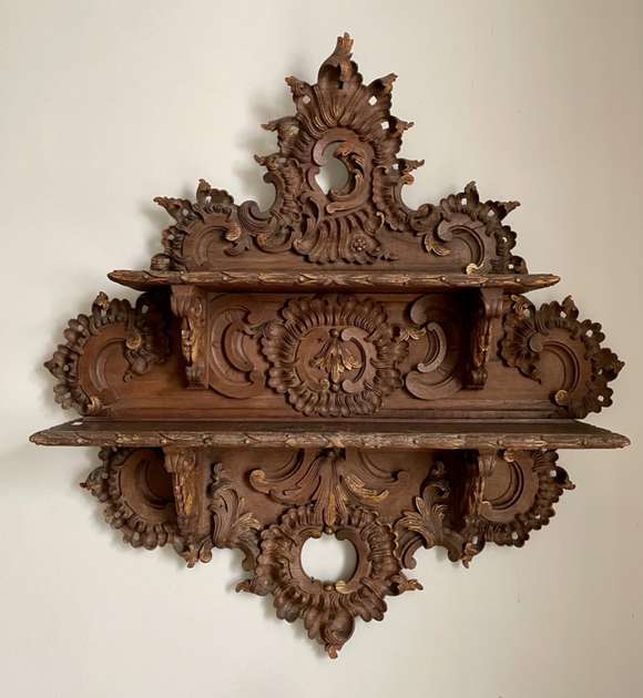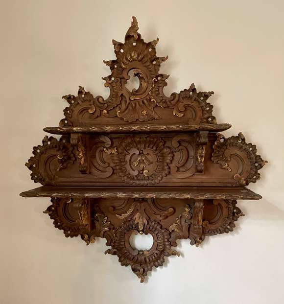 Porta bibelot de parede em madeira ricamente entalhada, duas prateleiras e detalhes vazados.