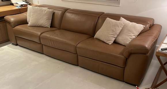 Sofá de couro na cor caramelo, em 3 módulos com movimentos elétricos com ativação touch. Medida de cada módulo com b...